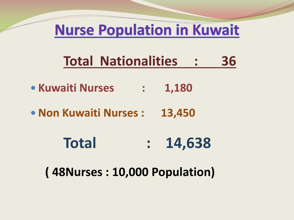 Nurse Population in Kuwait Total Nationalities : 36 • Kuwaiti Nurses : 1,180 • Non Kuwaiti Nurses : 13,450 Total : 14,638 ( 48Nurses : 10,000 Population)