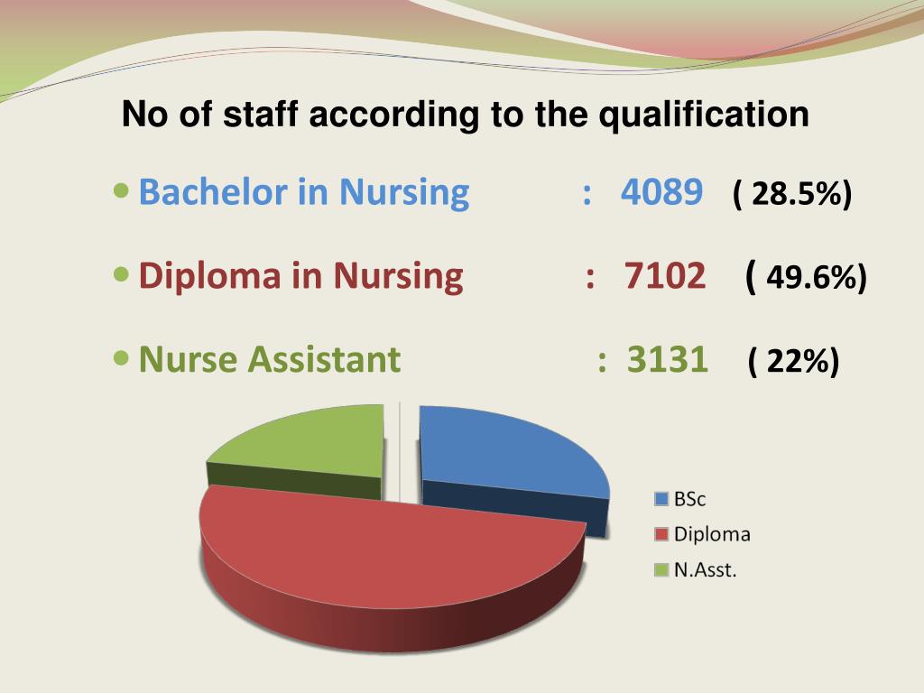 No of staff according to the qualification • Bachelor in Nursing : 4089 ( 28.5%) • Diploma in Nursing : 7102 (49.6%) • Nurse Assistant : 3131 ( 22%)