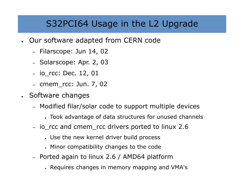 S32PCI64 Usage in the L2 Upgrade • Our software adapted from CERN code • Filarscope: Jun 14, 02 • Solarscope: Apr. 2, 03 • io_rcc: Dec. 12, 01 • cmem_rcc: Jun. 7, 02 • Software changes • Modified filar/solar code to support multiple devices • Took advantage of data structures for unused channels • io_rcc and cmem_rcc drivers ported to linux 2.6 • Use the new kernel driver build process • Minor compatibility changes to the code • Ported again to linux 2.6 / AMD64 platform • Requires changes in memory mapping and VMA's