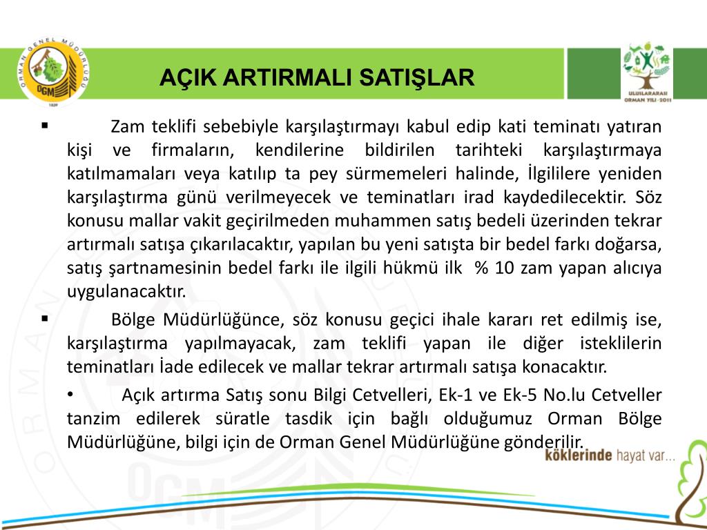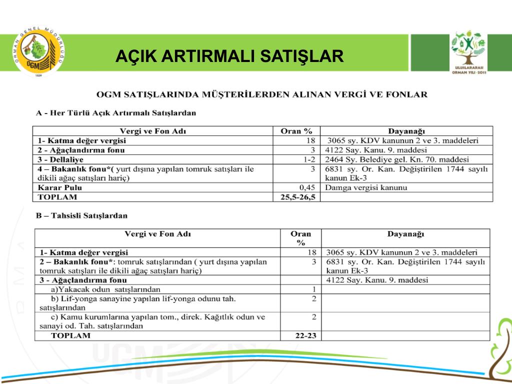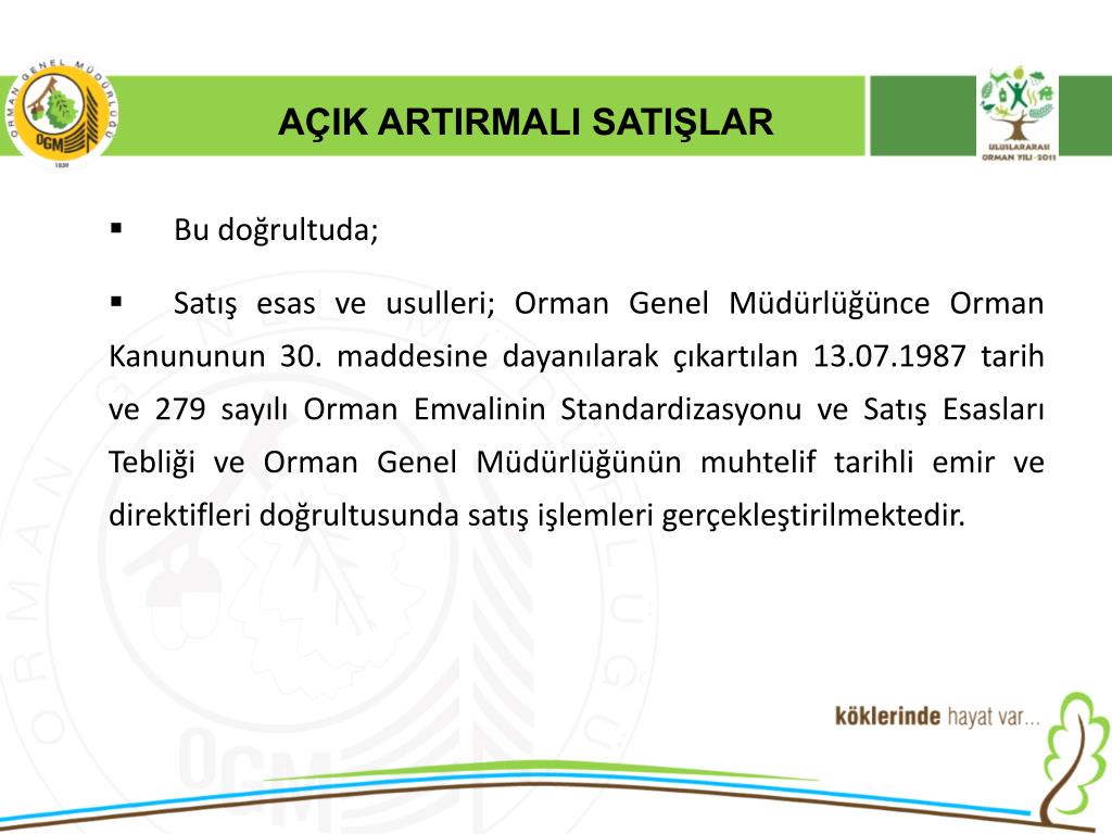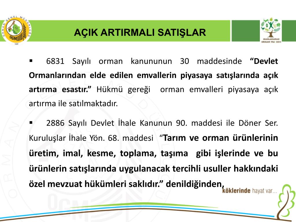 AÇIK ARTIRMALI SATIŞLAR • 6831 Sayılı orman kanununun 30 maddesinde “Devlet Ormanlarından elde edilen emvallerin piyasaya satışlarında açık artırma esastır.” Hükmü gereği orman emvalleri piyasaya açık artırma ile satılmaktadır. • 2886 Sayılı Devlet İhale Kanunun 90. maddesi ile Döner Ser. Kuruluşlar İhale Yön. 68. maddesi “Tarım ve orman ürünlerinin üretim, imal, kesme, toplama, taşıma gibi işlerinde ve bu ürünlerin satışlarında uygulanacak tercihli usuller hakkındaki özel mevzuat hükümleri saklıdır.” denildiğinden,