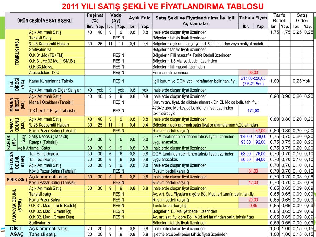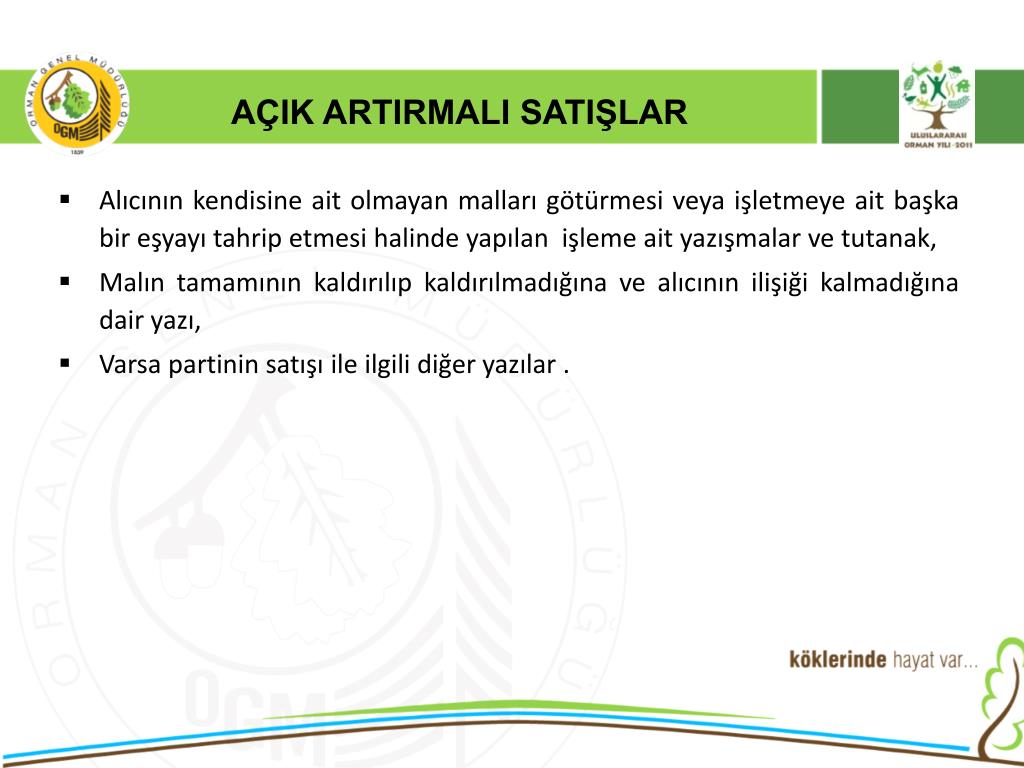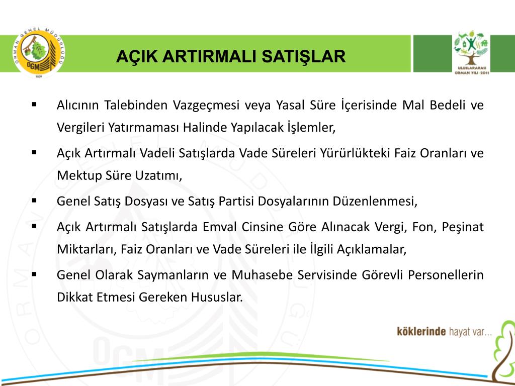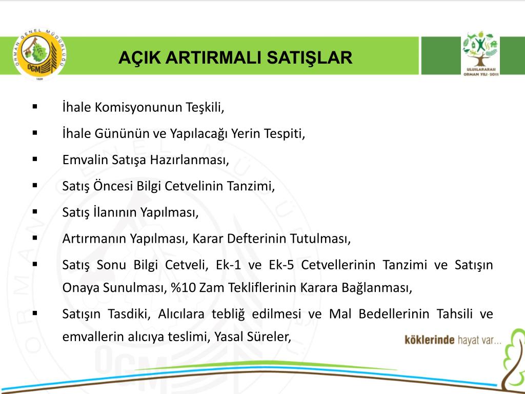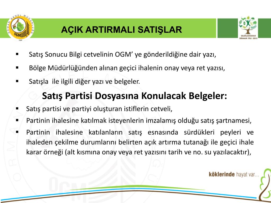 AÇIK ARTIRMALI SATIŞLAR • 6831 Sayılı orman kanununun 30 maddesinde “Devlet Ormanlarından elde edilen emvallerin piyasaya satışlarında açık artırma esastır.” Hükmü gereği orman emvalleri piyasaya açık artırma ile satılmaktadır. • 2886 Sayılı Devlet İhale Kanunun 90. maddesi ile Döner Ser. Kuruluşlar İhale Yön. 68. maddesi “Tarım ve orman ürünlerinin üretim, imal, kesme, toplama, taşıma gibi işlerinde ve bu ürünlerin satışlarında uygulanacak tercihli usuller hakkındaki özel mevzuat hükümleri saklıdır.” denildiğinden,