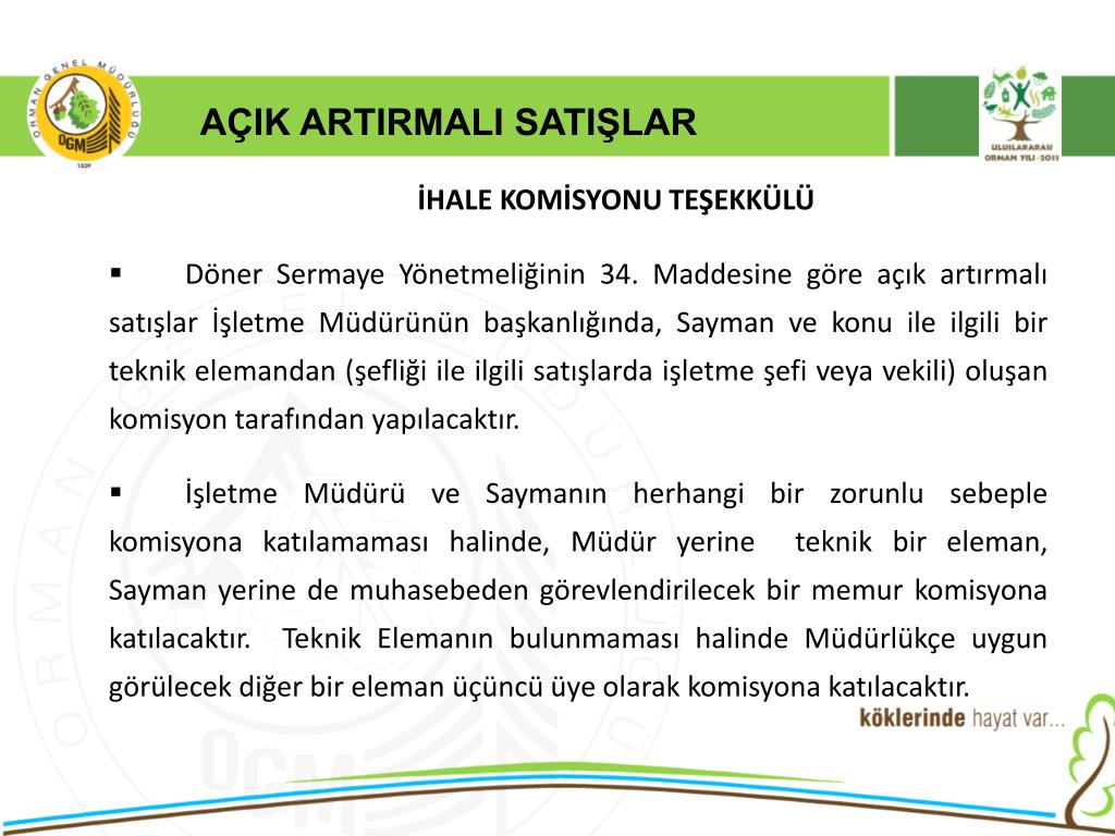 AÇIK ARTIRMALI SATIŞLAR İHALE KOMİSYONU TEŞEKKÜLÜ • Döner Sermaye Yönetmeliğinin 34. Maddesine göre açık artırmalı satışlar İşletme Müdürünün başkanlığında, Sayman ve konu ile ilgili bir teknik elemandan (şefliği ile ilgili satışlarda işletme şefi veya vekili) oluşan komisyon tarafından yapılacaktır. • İşletme Müdürü ve Saymanın herhangi bir zorunlu sebeple komisyona katılamaması halinde, Müdür yerine teknik bir eleman, Sayman yerine de muhasebeden görevlendirilecek bir memur komisyona katılacaktır. Teknik Elemanın bulunmaması halinde Müdürlükçe uygun görülecek diğer bir eleman üçüncü üye olarak komisyona katılacaktır.