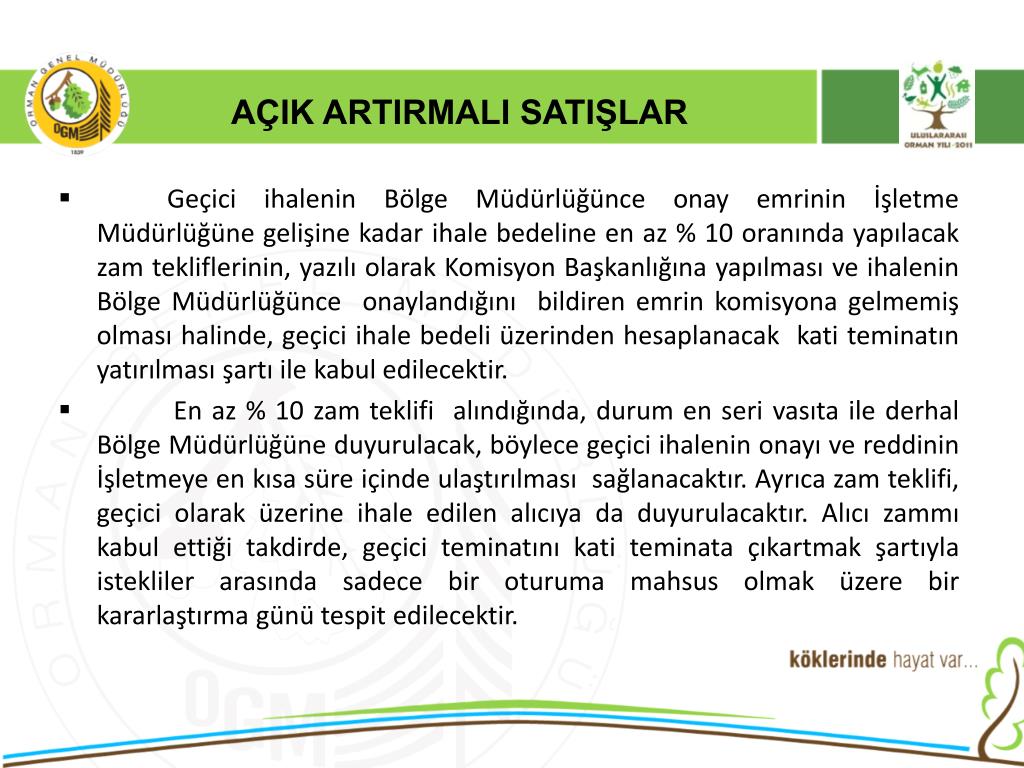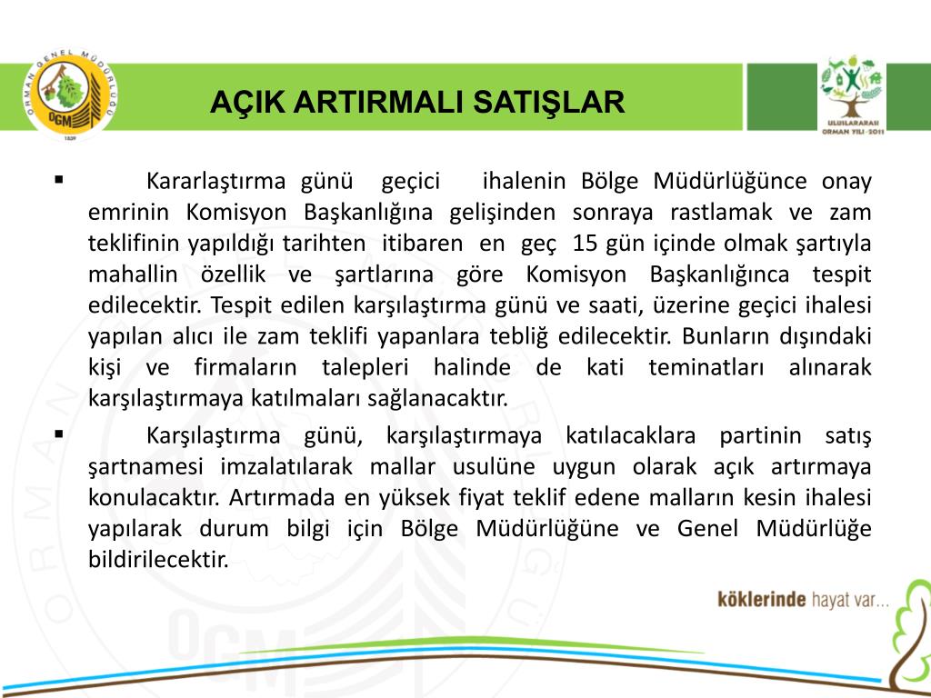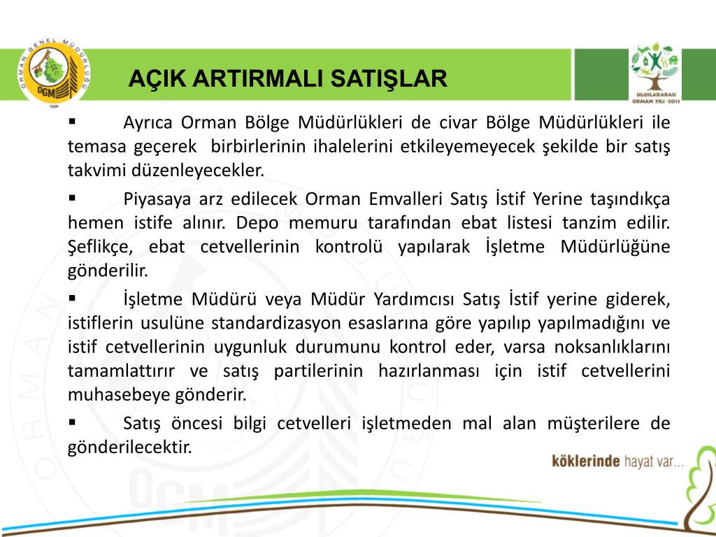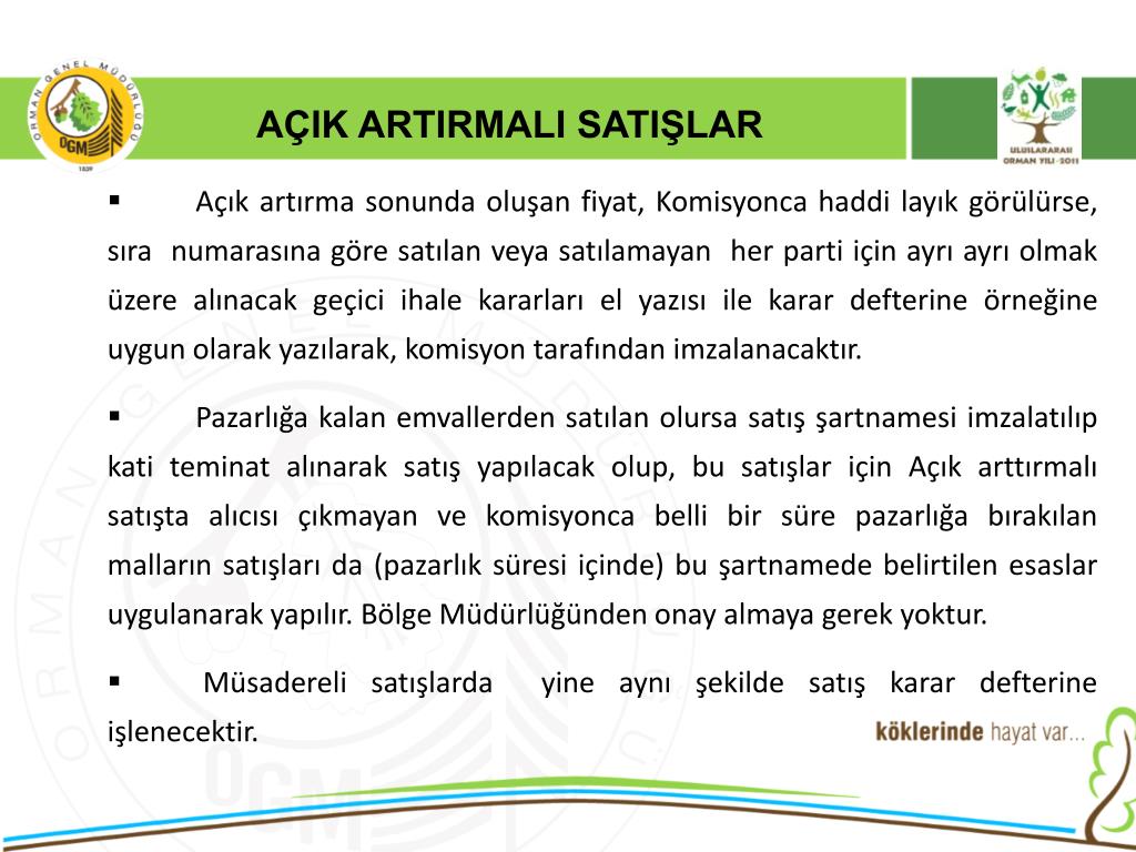 AÇIK ARTIRMALI SATIŞLAR Satış yapılacak yerlerde aranacak şartlar; • Belediyesi bulunan, PTT’si bulunan, oteli ve lokantası bulunan, yol durumu yaz kış nakliyata müsait olan, düzenli olarak nakil aracı işleyen, idaremize ait veya Belediyeye ait satış salonu bulunan yerlerde, açık artırmalı satış yapılacaktır. • Ancak orman emvali satışları ticari isterlere göre yapıldığından, malların değerince kıymetlendirilemeyeceği tespit edilen yerlerde ihale(satış) yapılmayacaktır.