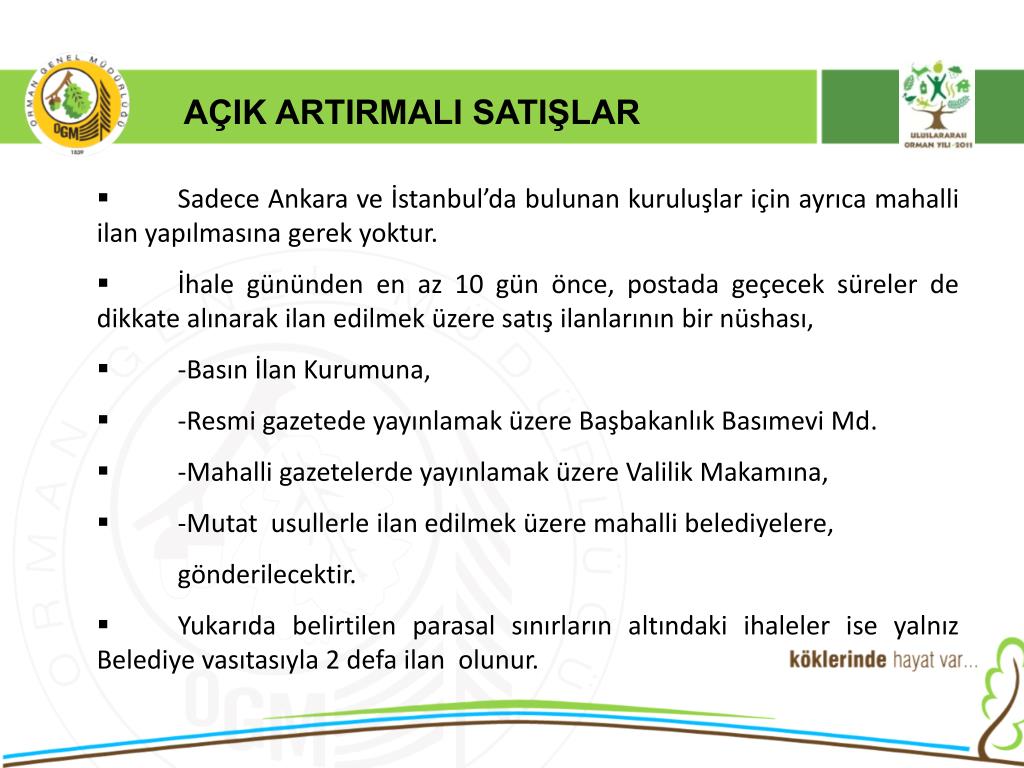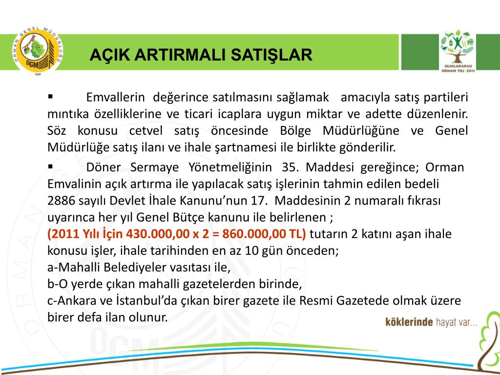 AÇIK ARTIRMALI SATIŞLAR • Emvallerin değerince satılmasını sağlamak amacıyla satış partileri mıntıka özelliklerine ve ticari icaplara uygun miktar ve adette düzenlenir. Söz konusu cetvel satış öncesinde Bölge Müdürlüğüne ve Genel Müdürlüğe satış ilanı ve ihale şartnamesi ile birlikte gönderilir. • Döner Sermaye Yönetmeliğinin 35. Maddesi gereğince; Orman Emvalinin açık artırma ile yapılacak satış işlerinin tahmin edilen bedeli 2886 sayılı Devlet İhale Kanunu’nun 17. Maddesinin 2 numaralı fıkrası uyarınca her yıl Genel Bütçe kanunu ile belirlenen ;(2011 Yılı İçin 430.000,00 x 2 = 860.000,00 TL)tutarın 2 katını aşan ihale konusu işler, ihale tarihinden en az 10 gün önceden; a-Mahalli Belediyeler vasıtası ile,b-O yerde çıkan mahalli gazetelerden birinde, c-Ankara ve İstanbul’da çıkan birer gazete ile Resmi Gazetede olmak üzere birer defa ilan olunur.