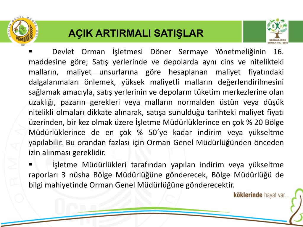 AÇIK ARTIRMALI SATIŞLAR • Devlet Orman İşletmesi Döner Sermaye Yönetmeliğinin 16. maddesine göre; Satış yerlerinde ve depolarda aynı cins ve nitelikteki malların, maliyet unsurlarına göre hesaplanan maliyet fiyatındaki dalgalanmaları önlemek, yüksek maliyetli malların değerlendirilmesini sağlamak amacıyla, satış yerlerinin ve depoların tüketim merkezlerine olan uzaklığı, pazarın gerekleri veya malların normalden üstün veya düşük nitelikli olmaları dikkate alınarak, satışa sunulduğu tarihteki maliyet fiyatı üzerinden, bir kez olmak üzere İşletme Müdürlüklerince en çok % 20 Bölge Müdürlüklerince de en çok % 50´ye kadar indirim veya yükseltme yapılabilir. Bu orandan fazlası için Orman Genel Müdürlüğünden önceden izin alınması gereklidir. • İşletme Müdürlükleri tarafından yapılan indirim veya yükseltme raporları 3 nüsha Bölge Müdürlüğüne gönderecek, Bölge Müdürlüğü de bilgi mahiyetinde Orman Genel Müdürlüğüne gönderecektir.