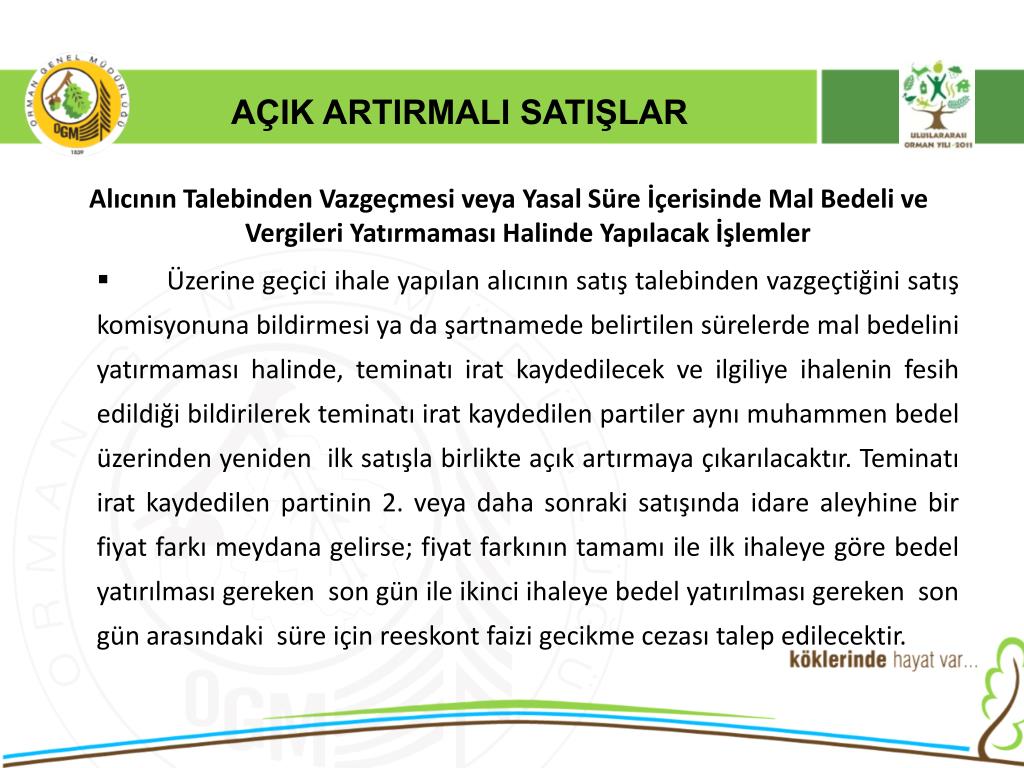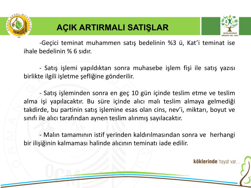 AÇIK ARTIRMALI SATIŞLAR -Geçici teminat muhammen satış bedelinin %3 ü, Kat’i teminat ise ihale bedelinin % 6 sıdır. - Satış işlemi yapıldıktan sonra muhasebe işlem fişi ile satış yazısı birlikte ilgili işletme şefliğine gönderilir. - Satış işleminden sonra en geç 10 gün içinde teslim etme ve teslim alma işi yapılacaktır. Bu süre içinde alıcı malı teslim almaya gelmediği takdirde, bu partinin satış işlemine esas olan cins, nev’i, miktarı, boyut ve sınıfı ile alıcı tarafından aynen teslim alınmış sayılacaktır. - Malın tamamının istif yerinden kaldırılmasından sonra ve herhangi bir ilişiğinin kalmaması halinde alıcının teminatı iade edilir.