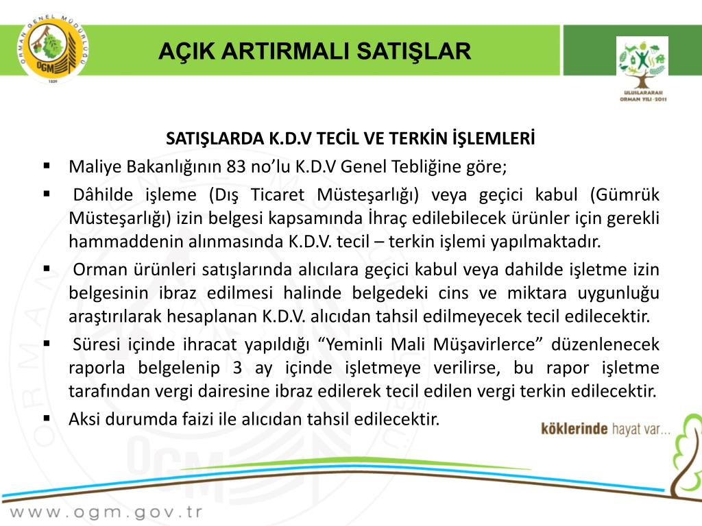 AÇIK ARTIRMALI SATIŞLAR SATIŞLARDA K.D.V TECİL VE TERKİN İŞLEMLERİ • Maliye Bakanlığının 83 no’lu K.D.V Genel Tebliğine göre; • Dâhilde işleme (Dış Ticaret Müsteşarlığı) veya geçici kabul (Gümrük Müsteşarlığı) izin belgesi kapsamında İhraç edilebilecek ürünler için gerekli hammaddenin alınmasında K.D.V. tecil – terkin işlemi yapılmaktadır. • Orman ürünleri satışlarında alıcılara geçici kabul veya dahilde işletme izin belgesinin ibraz edilmesi halinde belgedeki cins ve miktara uygunluğu araştırılarak hesaplanan K.D.V. alıcıdan tahsil edilmeyecek tecil edilecektir. • Süresi içinde ihracat yapıldığı “Yeminli Mali Müşavirlerce” düzenlenecek raporla belgelenip 3 ay içinde işletmeye verilirse, bu rapor işletme tarafından vergi dairesine ibraz edilerek tecil edilen vergi terkin edilecektir. • Aksi durumda faizi ile alıcıdan tahsil edilecektir.