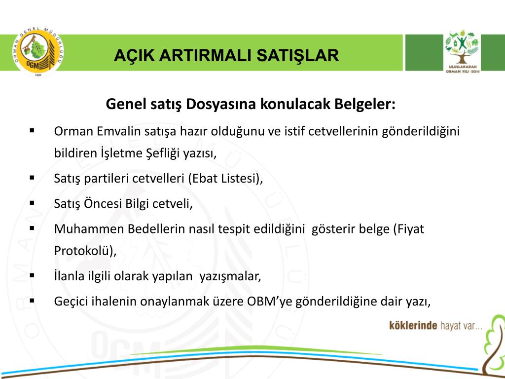 AÇIK ARTIRMALI SATIŞLAR Genel satış Dosyasına konulacak Belgeler: • Orman Emvalin satışa hazır olduğunu ve istif cetvellerinin gönderildiğini bildiren İşletme Şefliği yazısı, • Satış partileri cetvelleri (Ebat Listesi), • Satış Öncesi Bilgi cetveli, • Muhammen Bedellerin nasıl tespit edildiğini gösterir belge (Fiyat Protokolü), • İlanla ilgili olarak yapılan yazışmalar, • Geçici ihalenin onaylanmak üzere OBM’ye gönderildiğine dair yazı,