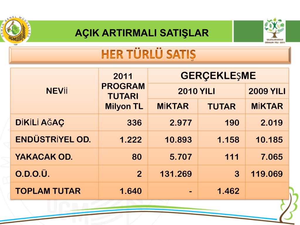 AÇIK ARTIRMALI SATIŞLAR Genel Müdürlüğümüze, Anayasa ve 3234 Sayılı Orman Genel Müdürlüğü Teşkilat ve Görevleri Hakkında Kanun ile verilen; • Ormanların korunması, geliştirilmesi ve devamlılığını sağlayacak şekilde teknik ve ekonomik icaplara göre idare edilerek işletilmesi görevlerini yapabilmesi, kurumumuzun, ülkemizin endüstriyel ve yakacak odun ile diğer orman ürünleri ihtiyacının zamanında ve piyasa şartlarına en uygun şekilde karşılayabilmesine bağlıdır. • Orman Genel Müdürlüğü, yukarıdaki görevlerini bir bütçe tekniğiyle yapmakta ve bunun en önemli yanı da bütçenin gelirleri olan orman ürünlerinin satışları sağlamaktır.