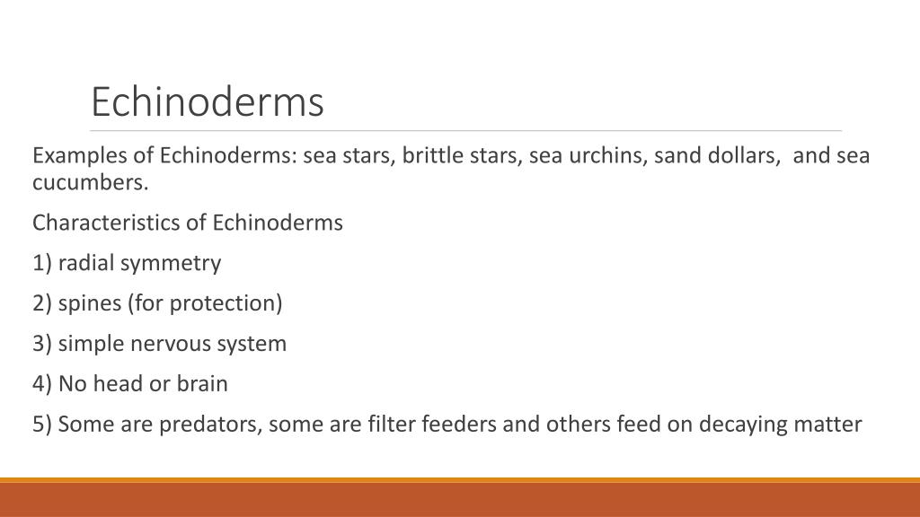 Echinoderms • Examples of Echinoderms: sea stars, brittle stars, sea urchins, sand dollars, and sea cucumbers. • Characteristics of Echinoderms • 1) radial symmetry • 2) spines (for protection) • 3) simple nervous system • 4) No head or brain • 5) Some are predators, some are filter feeders and others feed on decaying matter