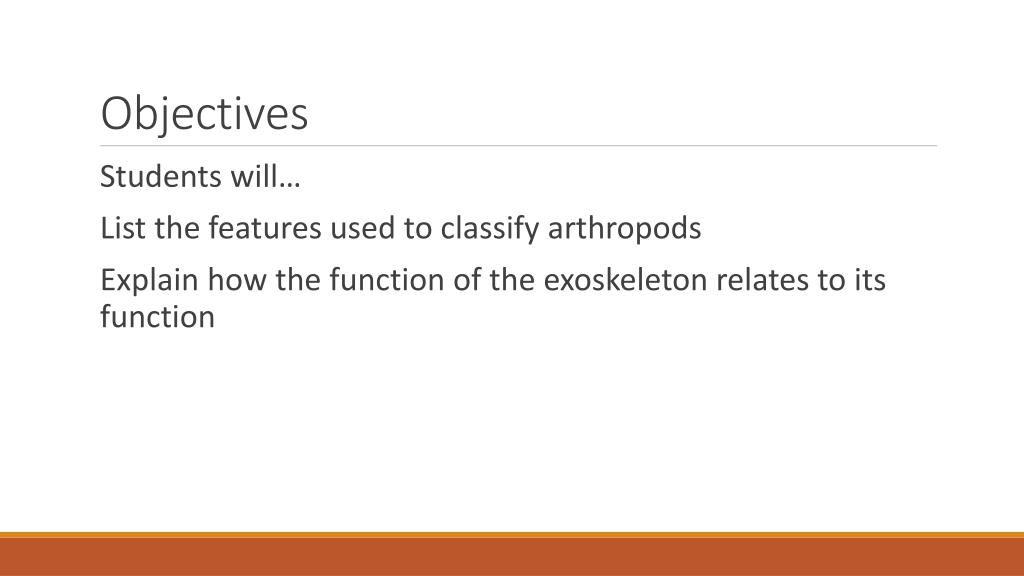 Objectives • Students will… • List the features used to classify arthropods • Explain how the function of the exoskeleton relates to its function
