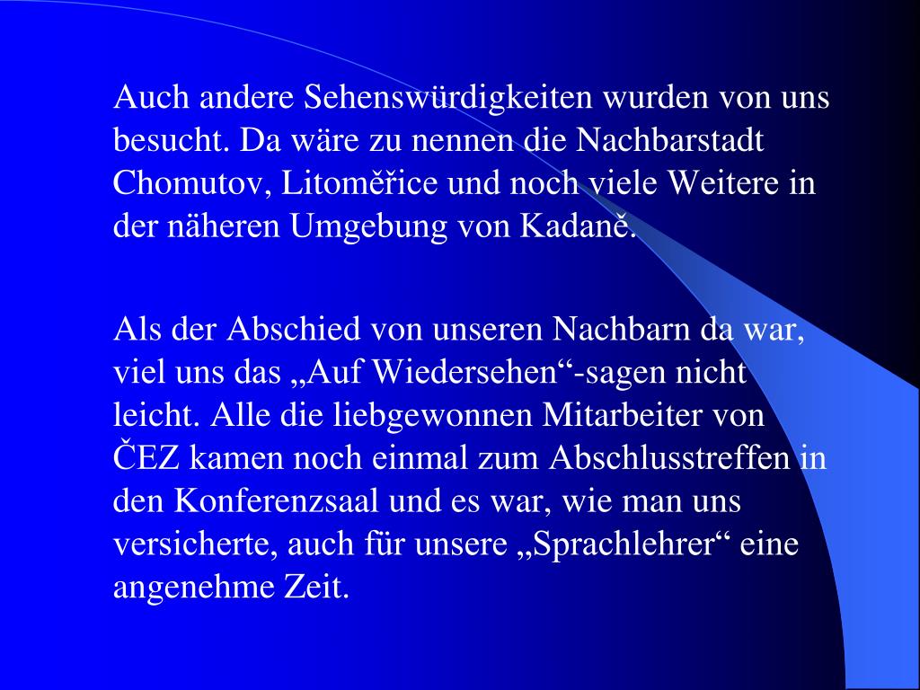 Auch andere Sehenswürdigkeiten wurden von uns besucht. Da wäre zu nennen die Nachbarstadt Chomutov, Litoměřice und noch viele Weitere in der näheren Umgebung von Kadaně. Als der Abschied von unseren Nachbarn da war, viel uns das „Auf Wiedersehen“-sagen nicht leicht. Alle die liebgewonnen Mitarbeiter von ČEZ kamen noch einmal zum Abschlusstreffen in den Konferenzsaal und es war, wie man uns versicherte, auch für unsere „Sprachlehrer“ eine angenehme Zeit.