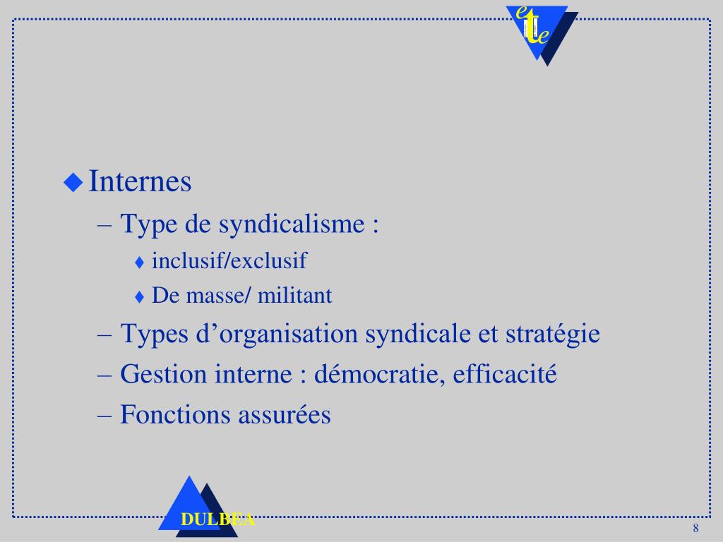Internes • Type de syndicalisme : • inclusif/exclusif • De masse/ militant • Types d’organisation syndicale et stratégie • Gestion interne : démocratie, efficacité • Fonctions assurées
