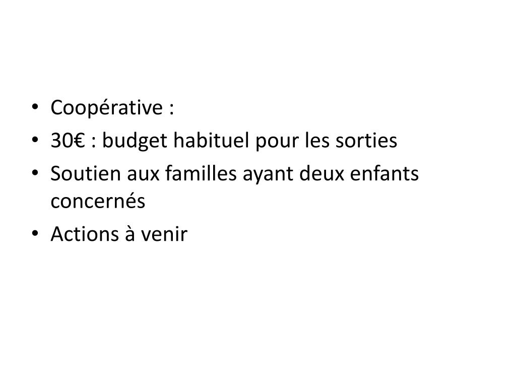 Coopérative : • 30€ : budget habituel pour les sorties • Soutien aux familles ayant deux enfants concernés • Actions à venir
