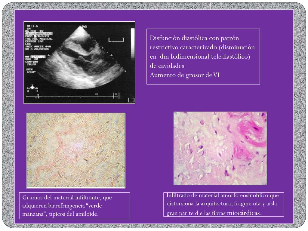 Disfunción diastólica con patrón restrictivo caracterizado (disminución en dm bidimensional telediastólico) de cavidades Aumento de grosor de VI Grumos del material infiltrante, que adquieren birrefringencia “verde manzana”, típicos del amiloide. Infiltrado de material amorfo eosinofílico que distorsiona la arquitectura, fragmenta y aísla gran par te d e las fibras miocárdicas.