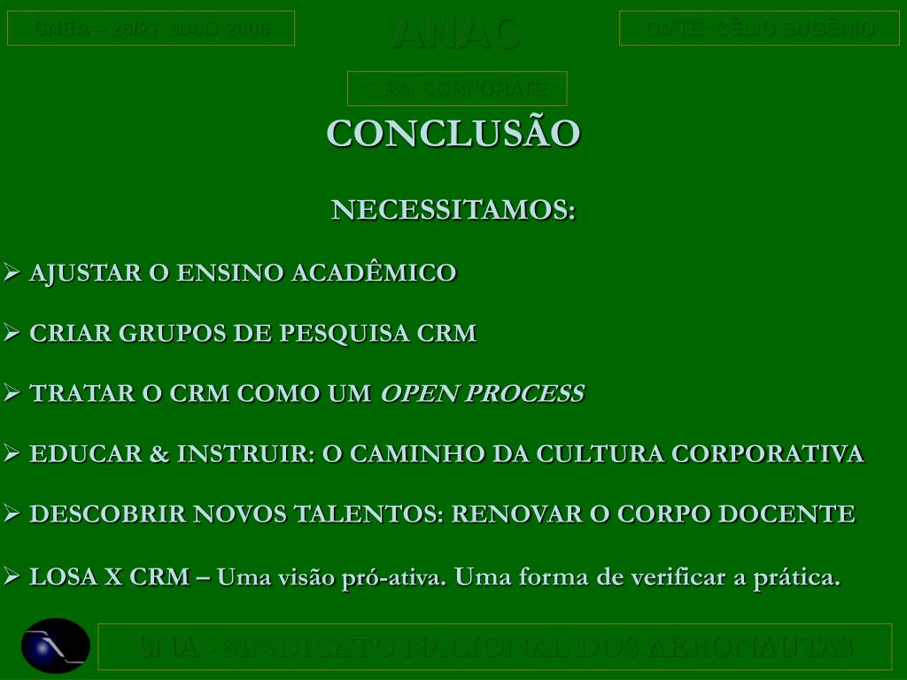 CONCLUSÃO NECESSITAMOS: • AJUSTAR O ENSINO ACADÊMICO • CRIAR GRUPOS DE PESQUISA CRM • TRATAR O CRM COMO UM OPEN PROCESS • EDUCAR & INSTRUIR: O CAMINHO DA CULTURA CORPORATIVA • DESCOBRIR NOVOS TALENTOS: RENOVAR O CORPO DOCENTE • LOSA X CRM – Uma visão pró-ativa. Uma forma de verificar a prática.