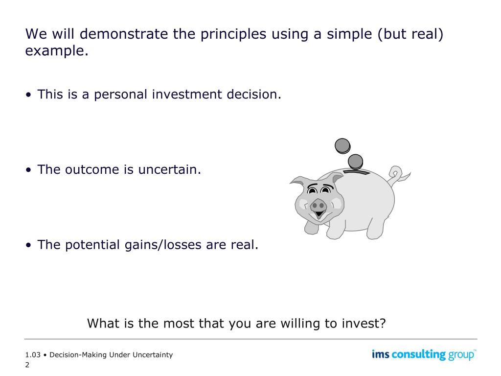 We will demonstrate the principles using a simple (but real) example. • This is a personal investment decision. • The outcome is uncertain. • The potential gains/losses are real. What is the most that you are willing to invest? 1.03 • Decision-Making Under Uncertainty