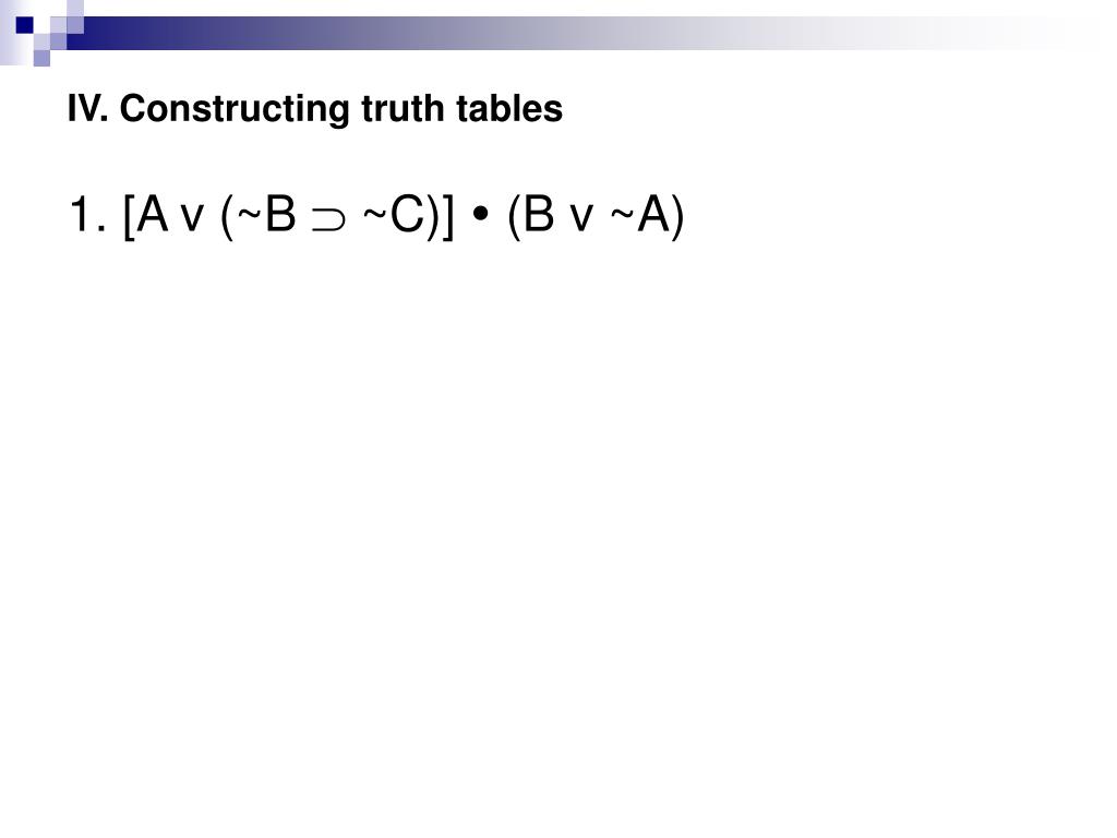 IV. Constructing truth tables • 1. [A v (~B ~C)] (B v ~A)