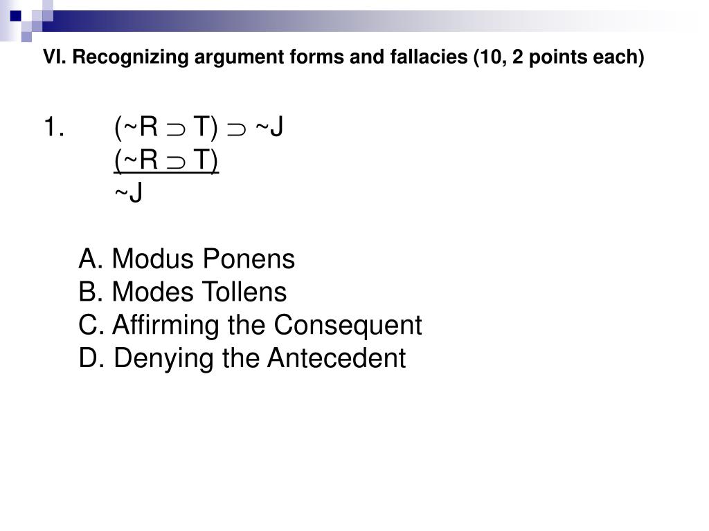 VI. Recognizing argument forms and fallacies (10, 2 points each) • 1. (~R T) ~J • (~R T) • ~J • A. Modus Ponens • B. Modes Tollens • C. Affirming the Consequent • D. Denying the Antecedent
