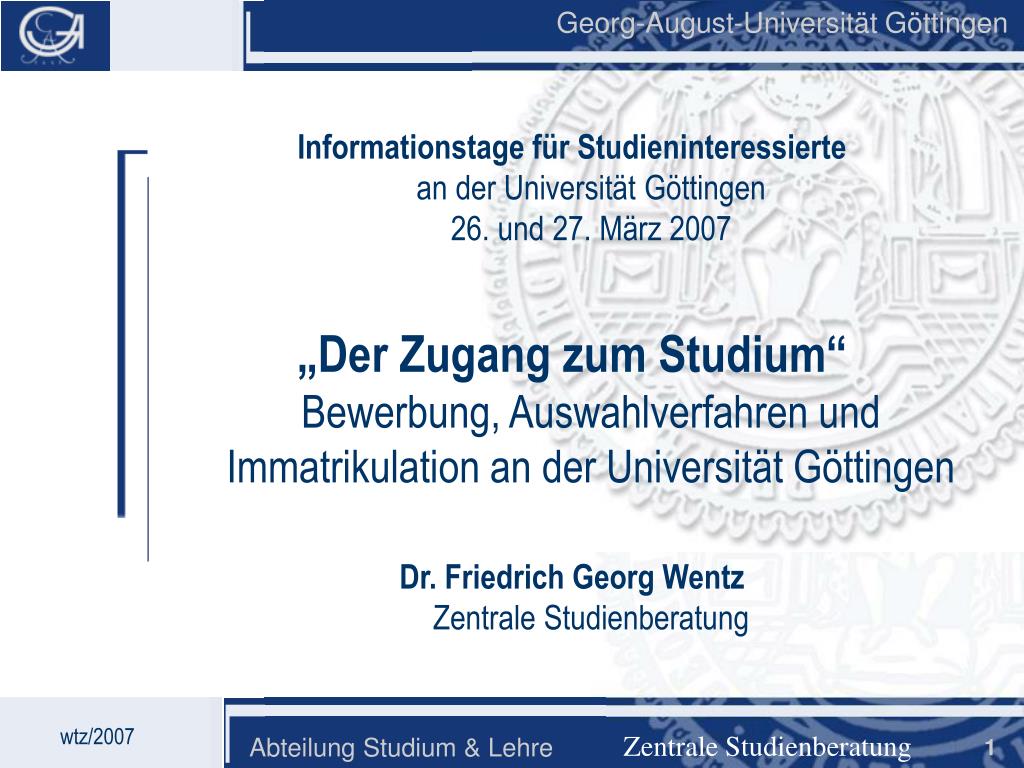 Georg-August-Universität Göttingen. Informationstage für Studieninteressierte an der Universität Göttingen 26. und 27. März 2007 „Der Zugang zum Studium“ Bewerbung, Auswahlverfahren und Immatrikulation an der Universität Göttingen Dr. Friedrich Georg Wentz Zentrale Studienberatung. wtz/2007.