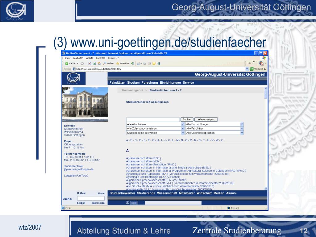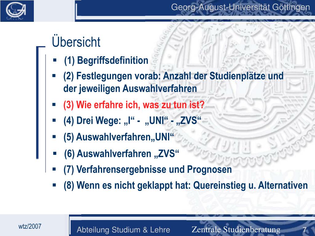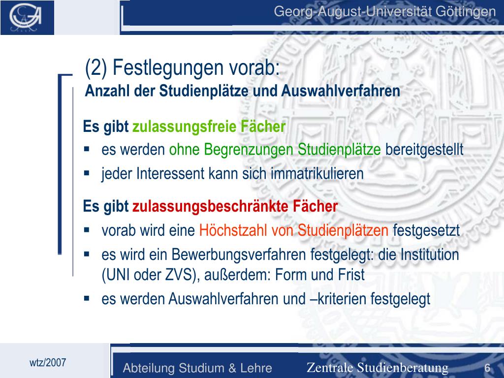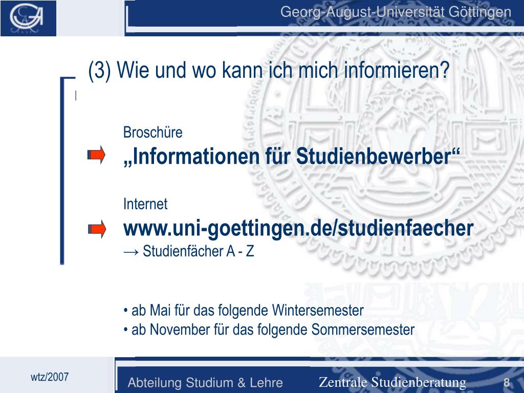 Georg-August-Universität Göttingen (3) Informationen für Studienbewerber wtz/2007 Abteilung Studium & Lehre Zentrale Studienberatung