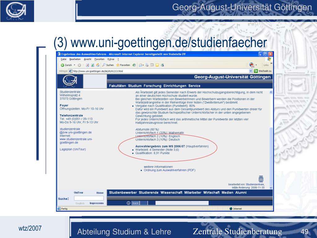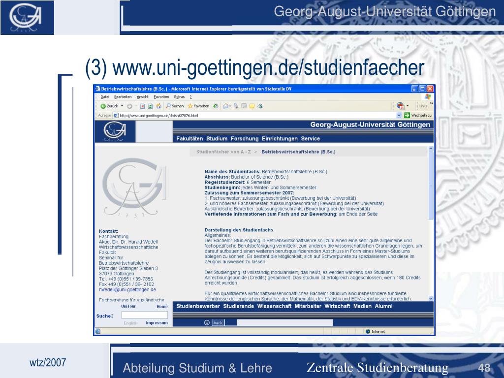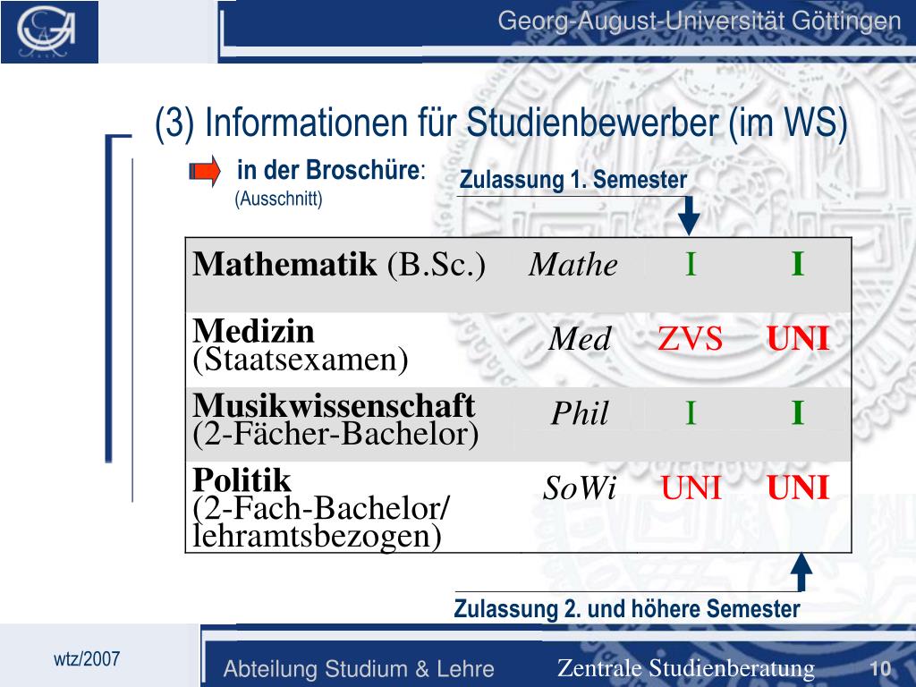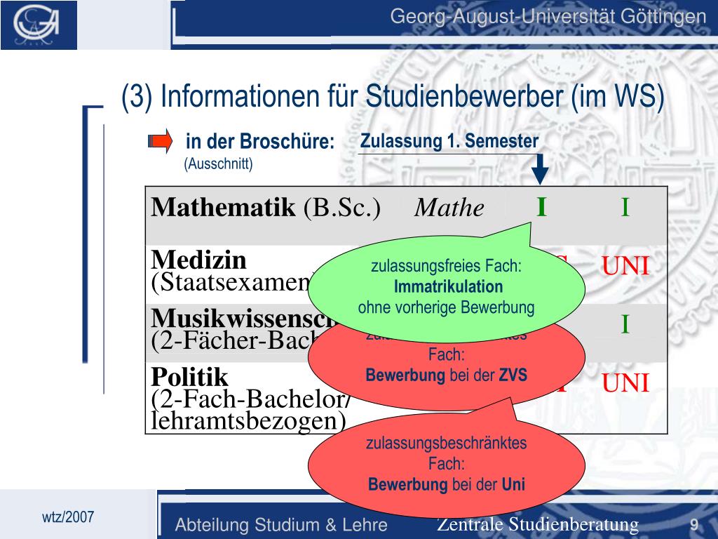 Georg-August-Universität Göttingen (3) Informationen für Studienbewerber wtz/2007 Abteilung Studium & Lehre Zentrale Studienberatung