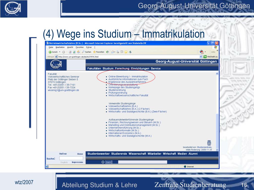 Georg-August-Universität Göttingen (4) Wege ins Studium – Immatrikulation wtz/2007 Abteilung Studium & Lehre Zentrale Studienberatung