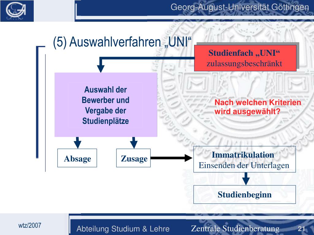 Georg-August-Universität Göttingen Studienfach „UNI“zulassungsbeschränkt Absage Studienbeginn (4) Wege ins Studium – „UNI“ Bewerbung 1. TeilDateneingabe per Internet WS: bis 15. JuliSoS: bis 15. Januar Bewerbung 2. TeilEinsenden derUnterlagen Immatrikulation Einsenden derUnterlagen Zusage WS: Mitte OktoberSoS: Mitte April wtz/2007 Abteilung Studium & Lehre Zentrale Studienberatung