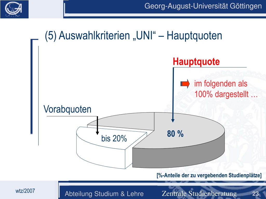 Georg-August-Universität Göttingen Hauptquote Vorabquoten 80 % bis 20% (5) Auswahlkriterien „UNI“ – Hauptquoten im folgenden als 100% dargestellt … [%-Anteile der zu vergebenden Studienplätze] wtz/2007 Abteilung Studium & Lehre Zentrale Studienberatung