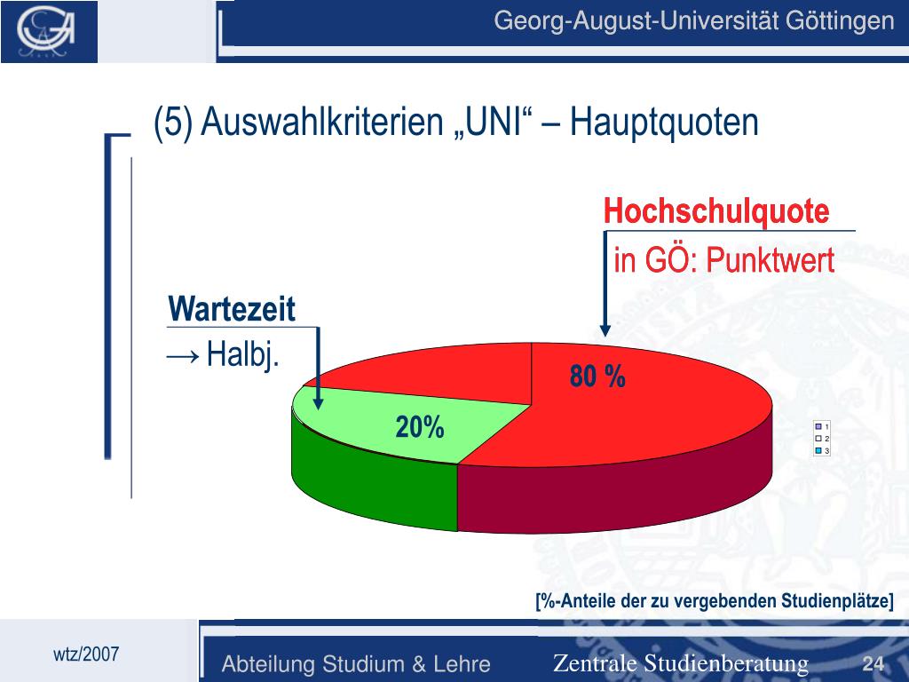 Georg-August-Universität Göttingen Hochschulquote Hochschulquote in GÖ: Punktwert in GÖ: Punktwert Wartezeit →Halbj. 20% 80 % 80 % (5) Auswahlkriterien „UNI“ – Hauptquoten 1 2 3 [%-Anteile der zu vergebenden Studienplätze] wtz/2007 Abteilung Studium & Lehre Zentrale Studienberatung