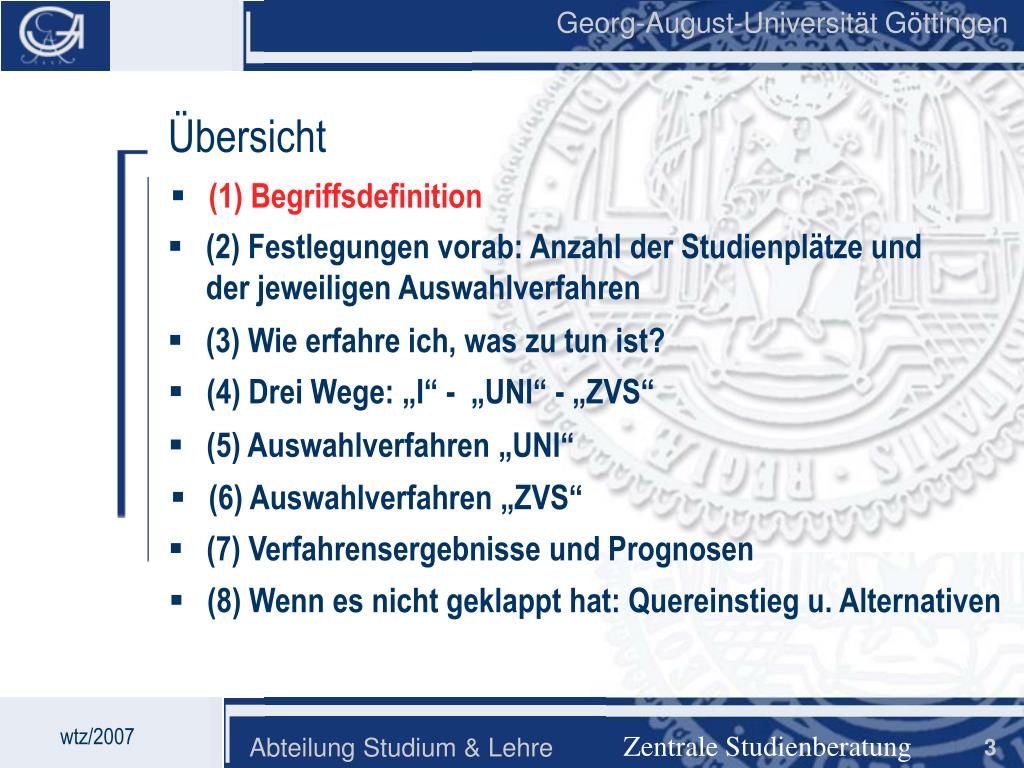 Georg-August-Universität Göttingen Übersicht • (1) Begriffsdefinition • (2) Festlegungen vorab: Anzahl der Studienplätze und der jeweiligen Auswahlverfahren • (3) Wie erfahre ich, was zu tun ist? • (4) Drei Wege: „I“ - „UNI“ - „ZVS“ • (5) Auswahlverfahren „UNI“ • (6) Auswahlverfahren „ZVS“ • (7) Verfahrensergebnisse und Prognosen • (8) Wenn es nicht geklappt hat: Quereinstieg u. Alternativen wtz/2007 Abteilung Studium & Lehre Zentrale Studienberatung