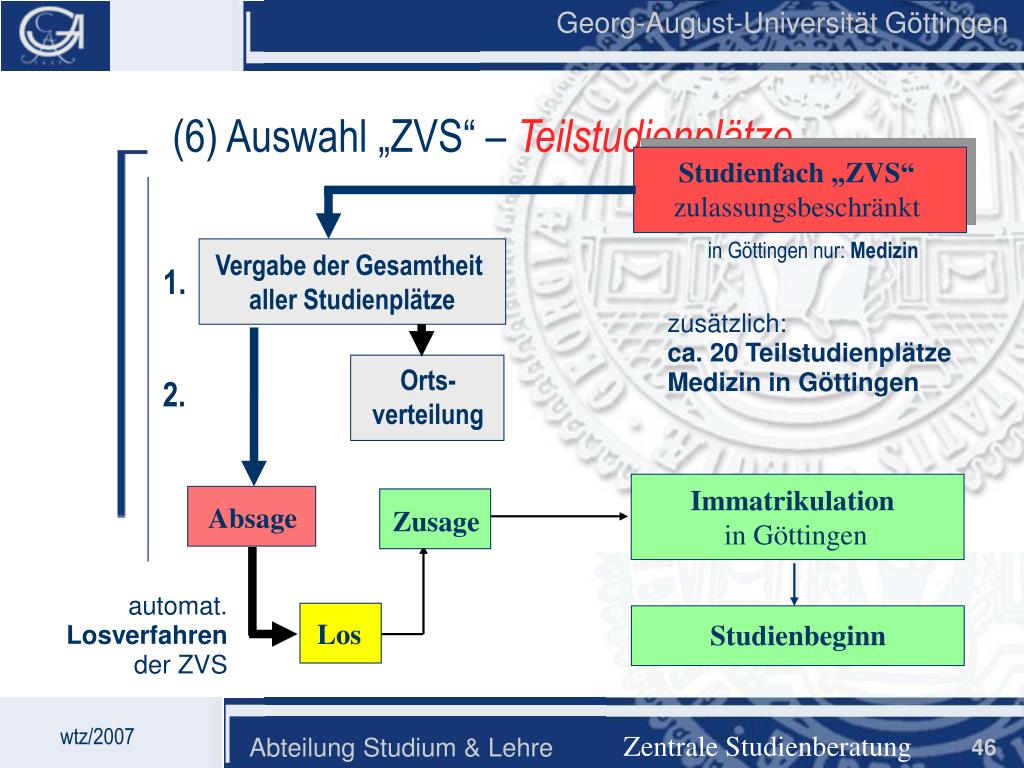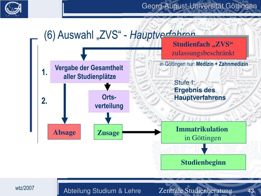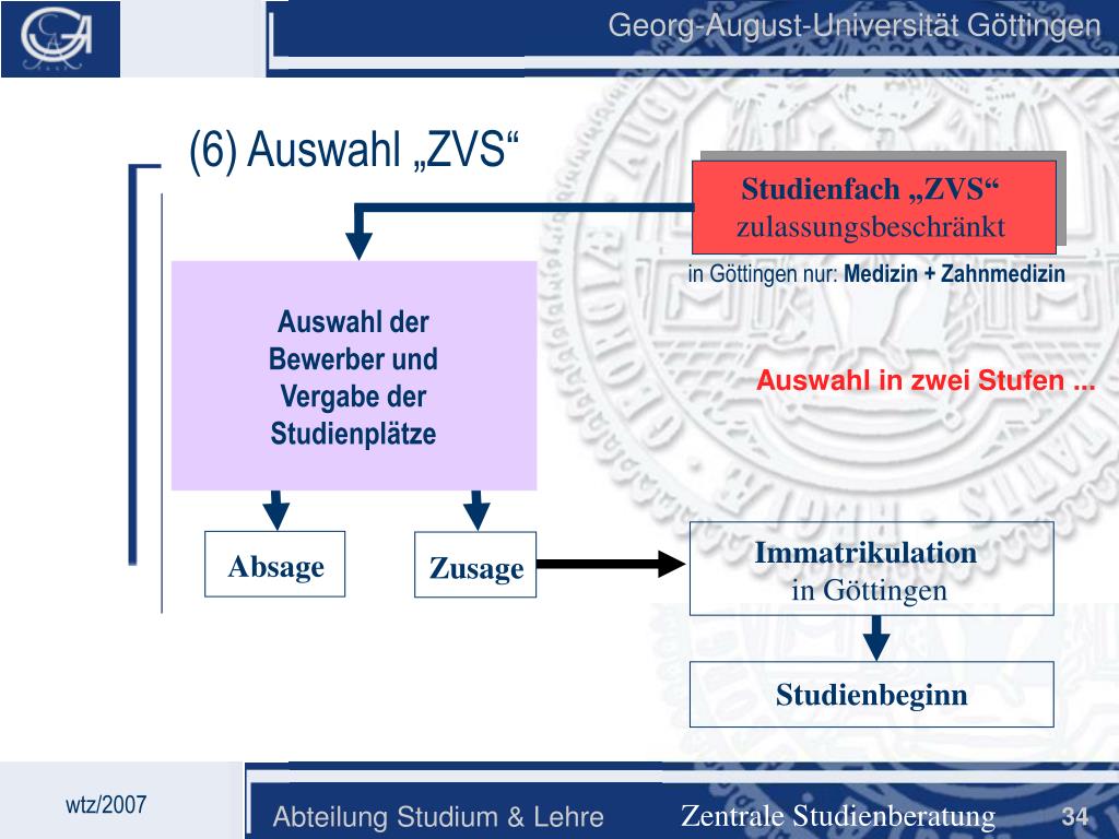 Georg-August-Universität Göttingen Studienfach „ZVS“zulassungsbeschränkt Auswahl der Bewerber und Vergabe der Studienplätze Zusage Studienbeginn (6) Auswahl „ZVS“ in Göttingen nur: Medizin + Zahnmedizin Auswahl in zwei Stufen ... Immatrikulation in Göttingen Absage wtz/2007 Abteilung Studium & Lehre Zentrale Studienberatung