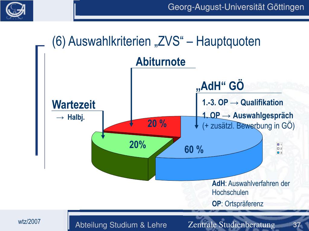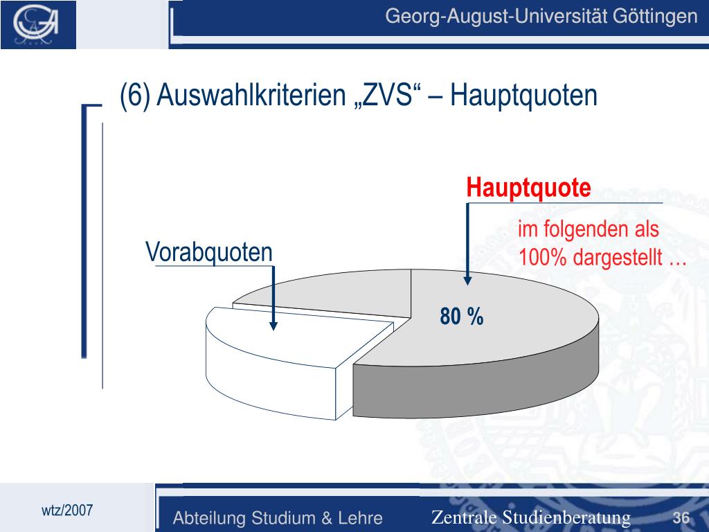 Georg-August-Universität Göttingen Hauptquote Vorabquoten 80 % (6) Auswahlkriterien „ZVS“ – Hauptquoten im folgenden als 100% dargestellt … wtz/2007 Abteilung Studium & Lehre Zentrale Studienberatung