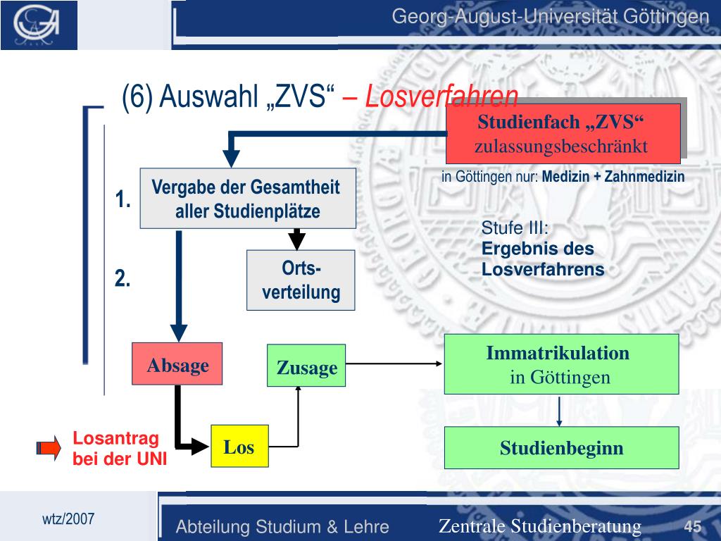 Georg-August-Universität Göttingen Studienfach „ZVS“zulassungsbeschränkt Vergabe der Gesamtheit aller Studienplätze 1. Los Immatrikulation in Göttingen Zusage Studienbeginn – Losverfahren (6) Auswahl „ZVS“ in Göttingen nur: Medizin + Zahnmedizin Stufe III:Ergebnis des Losverfahrens Orts-verteilung 2. Absage Losantrag bei der UNI wtz/2007 Abteilung Studium & Lehre Zentrale Studienberatung