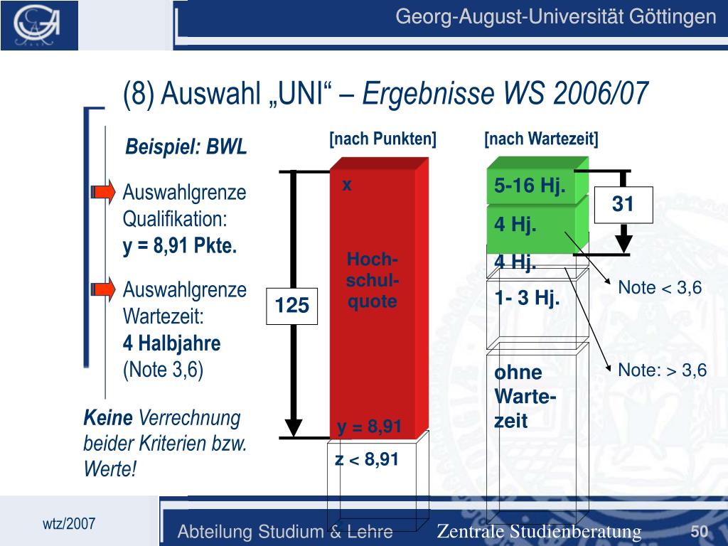 Georg-August-Universität Göttingen [Hochschul-quote] [nach Note] [nach Wartezeit] GÖ 1,0 1,9 3-16 Hj. 2 Hj. 2,0 1 Hj. 2,1 2,9 ohne Warte-zeit > 3,0 (6) Auswahl „ZVS“ – Rangreihen jeder Bewerber wird in dieRangreihen „Note“ und „Wartezeit“ eingeordnet Bewerber, die Göttingen als1. bis 3. Studienortnennen, werden in der „Hochschulquote“berücksichtigt wtz/2007 Abteilung Studium & Lehre Zentrale Studienberatung