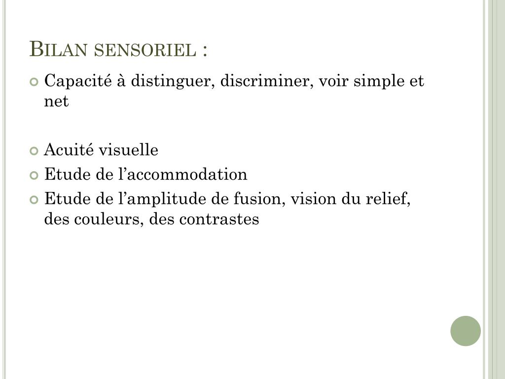 Bilan sensoriel : • Capacité à distinguer, discriminer, voir simple et net • Acuité visuelle • Etude de l’accommodation • Etude de l’amplitude de fusion, vision du relief, des couleurs, des contrastes