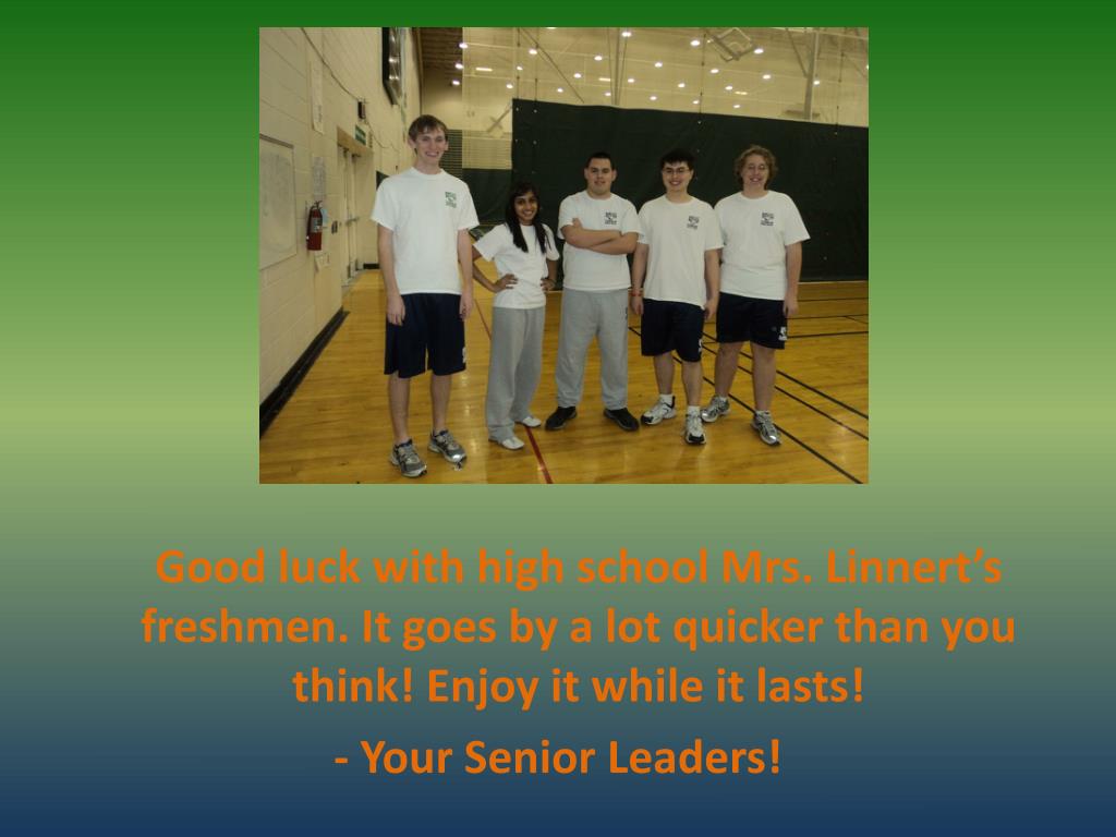 Good luck with high school Mrs. Linnert’s freshmen. It goes by a lot quicker than you think! Enjoy it while it lasts! - Your Senior Leaders!