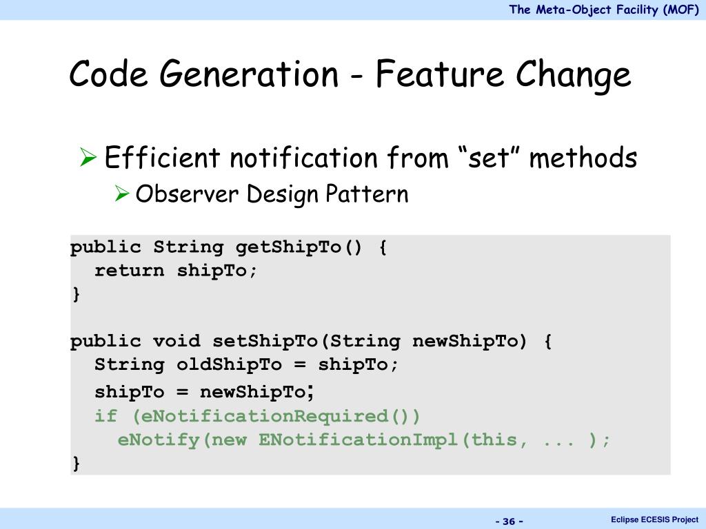 Code Generation - Feature Change • Efficient notification from “set” methods • Observer Design Pattern public String getShipTo() { return shipTo; } public void setShipTo(String newShipTo) { String oldShipTo = shipTo; shipTo = newShipTo; if (eNotificationRequired()) eNotify(new ENotificationImpl(this, ... ); }