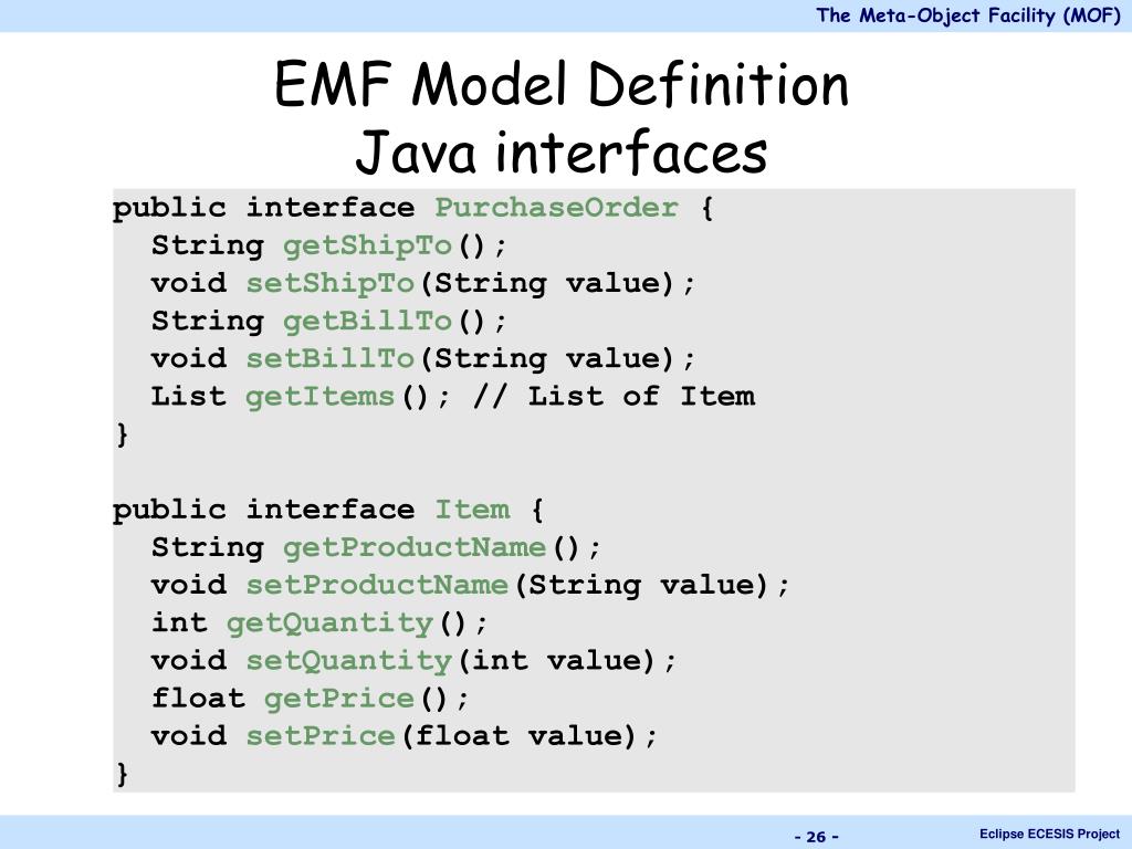 EMF Model Definition Java interfaces public interface PurchaseOrder { String getShipTo(); void setShipTo(String value); String getBillTo(); void setBillTo(String value); List getItems(); // List of Item } public interface Item { String getProductName(); void setProductName(String value); int getQuantity(); void setQuantity(int value); float getPrice(); void setPrice(float value); }