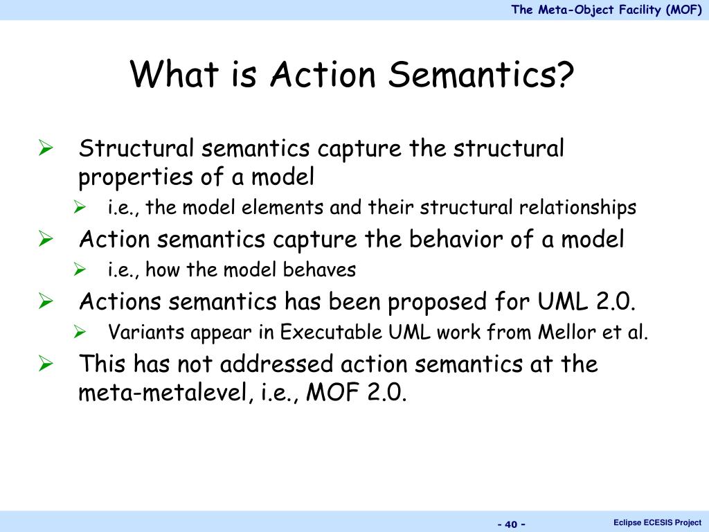 What is Action Semantics? • Structural semantics capture the structural properties of a model • i.e., the model elements and their structural relationships • Action semantics capture the behavior of a model • i.e., how the model behaves • Actions semantics has been proposed for UML 2.0. • Variants appear in Executable UML work from Mellor et al. • This has not addressed action semantics at the meta-metalevel, i.e., MOF 2.0.