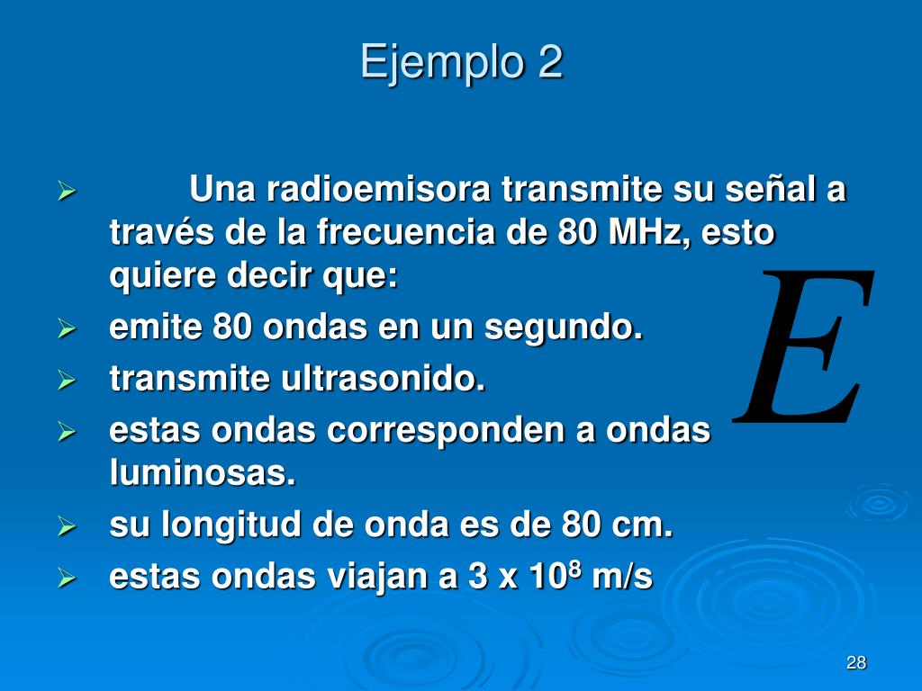Una radioemisora transmite su señal a través de la frecuencia de 80 MHz, esto quiere decir que: emite 80 ondas en un segundo. transmite ultrasonido. estas ondas corresponden a ondas luminosas. su longitud de onda es de 80 cm. estas ondas viajan a 3 x 108 m/s Ejemplo 2