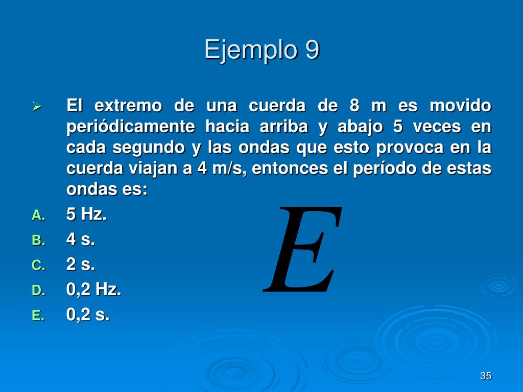 Ejemplo 9 • El extremo de una cuerda de 8 m es movido periódicamente hacia arriba y abajo 5 veces en cada segundo y las ondas que esto provoca en la cuerda viajan a 4 m/s, entonces el período de estas ondas es: • 5 Hz. • 4 s. • 2 s. • 0,2 Hz. • 0,2 s.