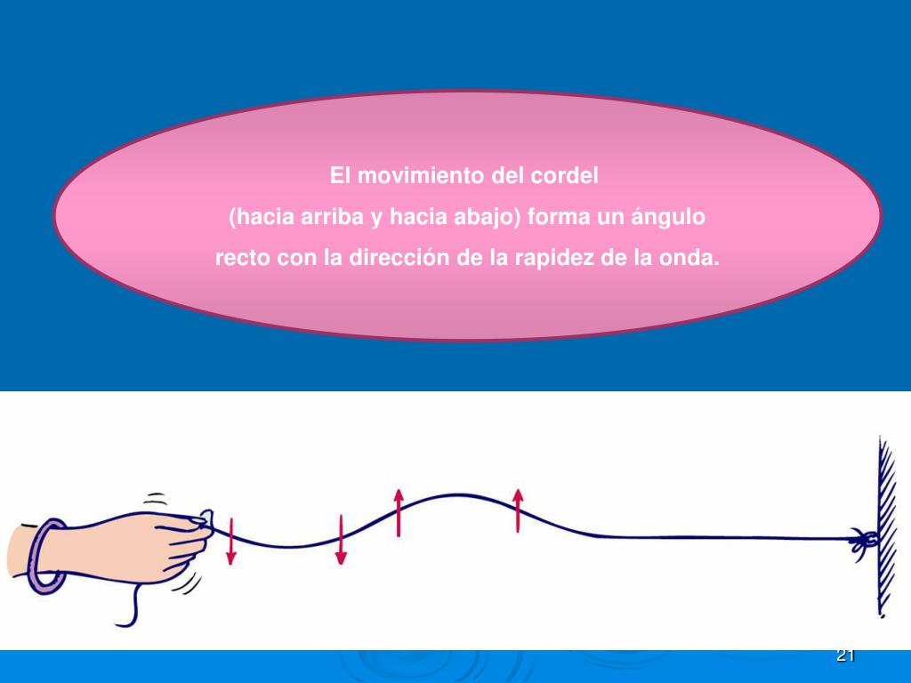 El movimiento del cordel (hacia arriba y hacia abajo) forma un ángulo recto con la dirección de la rapidez de la onda.