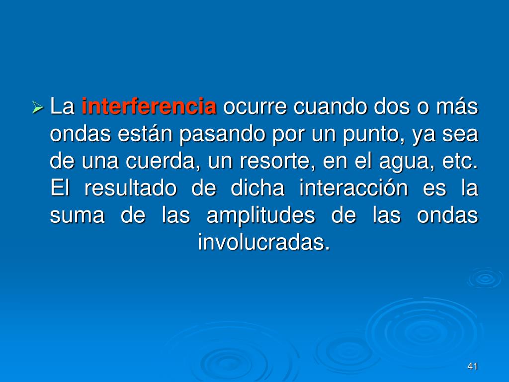 La interferencia ocurre cuando dos o más ondas están pasando por un punto, ya sea de una cuerda, un resorte, en el agua, etc. El resultado de dicha interacción es la suma de las amplitudes de las ondas involucradas.