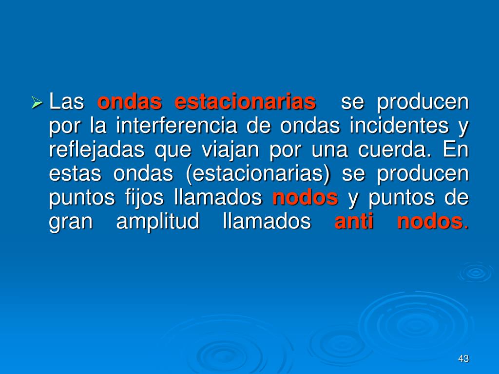 Las ondas estacionarias se producen por la interferencia de ondas incidentes y reflejadas que viajan por una cuerda. En estas ondas (estacionarias) se producen puntos fijos llamados nodos y puntos de gran amplitud llamados anti nodos.