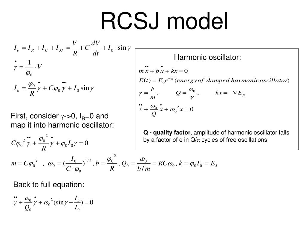 RCSJ model Harmonic oscillator: First, consider g->0, IB=0 and map it into harmonic oscillator: Q - quality factor, amplitude of harmonic oscillator falls by a factor of e in Q/p cycles of free oscillations Back to full equation: