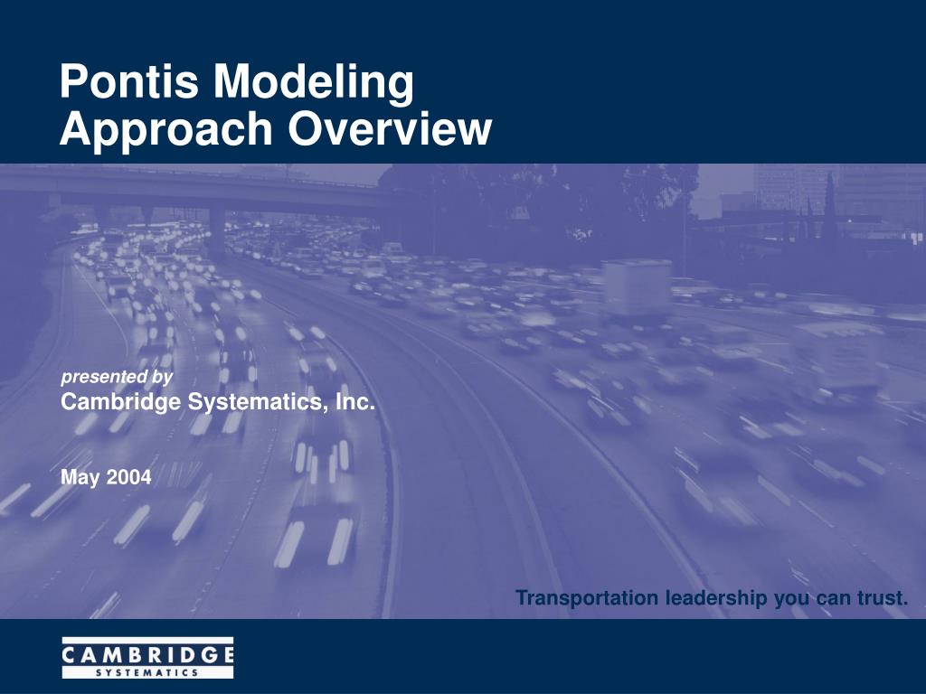 Pontis Modeling Approach Overview. Transportation leadership you can trust. presented by Cambridge Systematics, Inc. May 2004. Outline. What is Pontis? Developing a preservation policy in Pontis Simulating bridge conditions New modeling features in Pontis