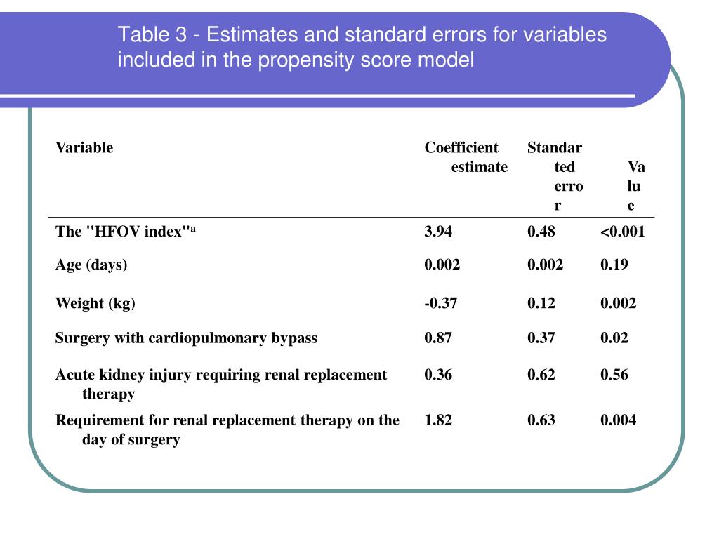 Table 3 - Estimates and standard errors for variables included in the propensity score model