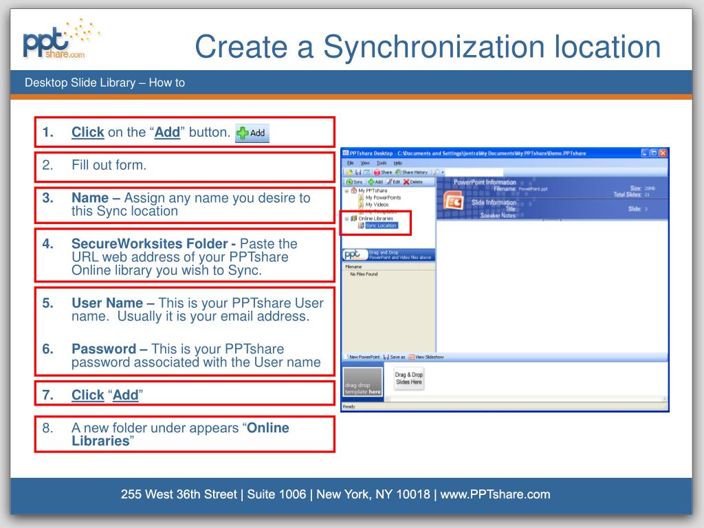 Create a Synchronization location Desktop Slide Library – How to • Click on the “Add” button. • Fill out form. • Name – Assign any name you desire to this Sync location • SecureWorksites Folder - Paste the URL web address of your PPTshare Online library you wish to Sync. • User Name – This is your PPTshare User name. Usually it is your email address. • Password – This is your PPTshare password associated with the User name • Click “Add” • A new folder under appears “Online Libraries”