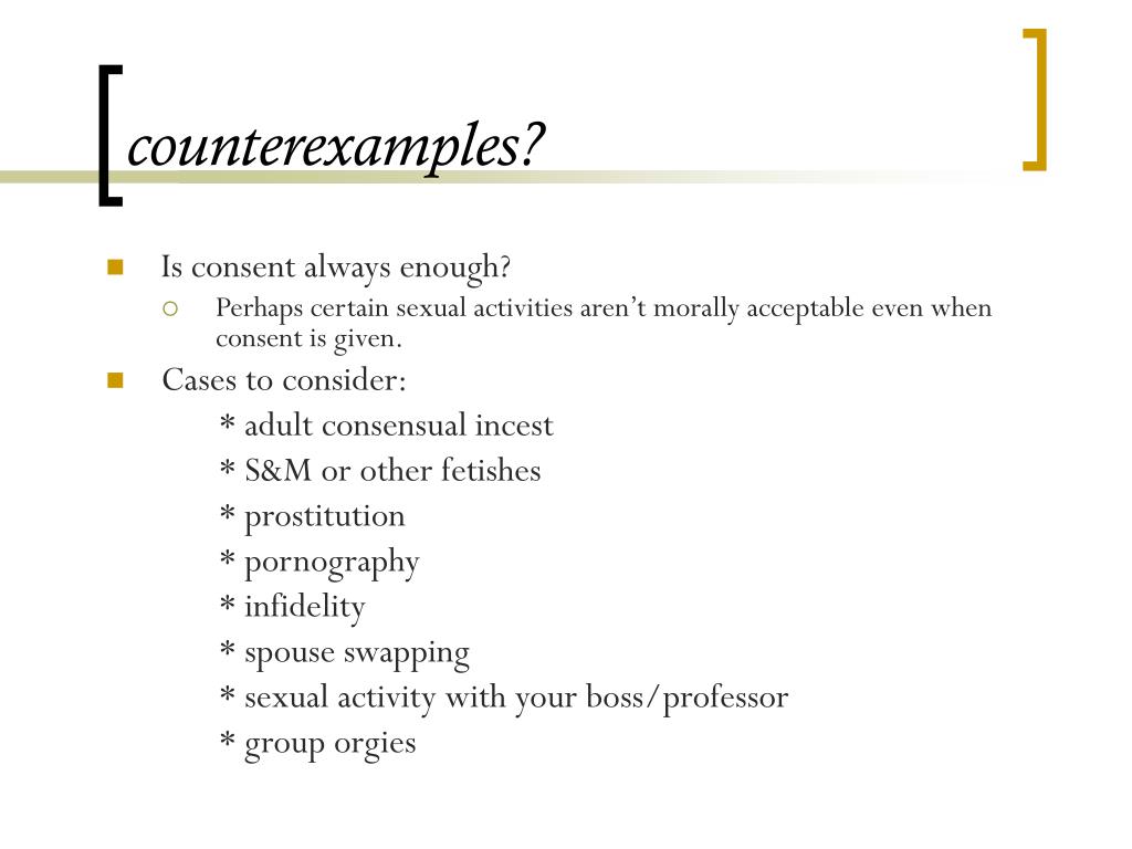 counterexamples? • Is consent always enough? • Perhaps certain sexual activities aren’t morally acceptable even when consent is given. • Cases to consider: * adult consensual incest * S&M or other fetishes * prostitution * pornography * infidelity * spouse swapping * sexual activity with your boss/professor * group orgies